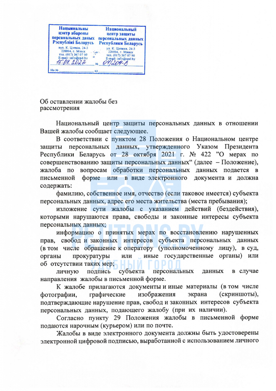 - провести проверку фактов распространение (предоставление) оператором персональных данных граждан Республики Беларусь неограниченному кругу лиц, указанных в настоящем обращении;