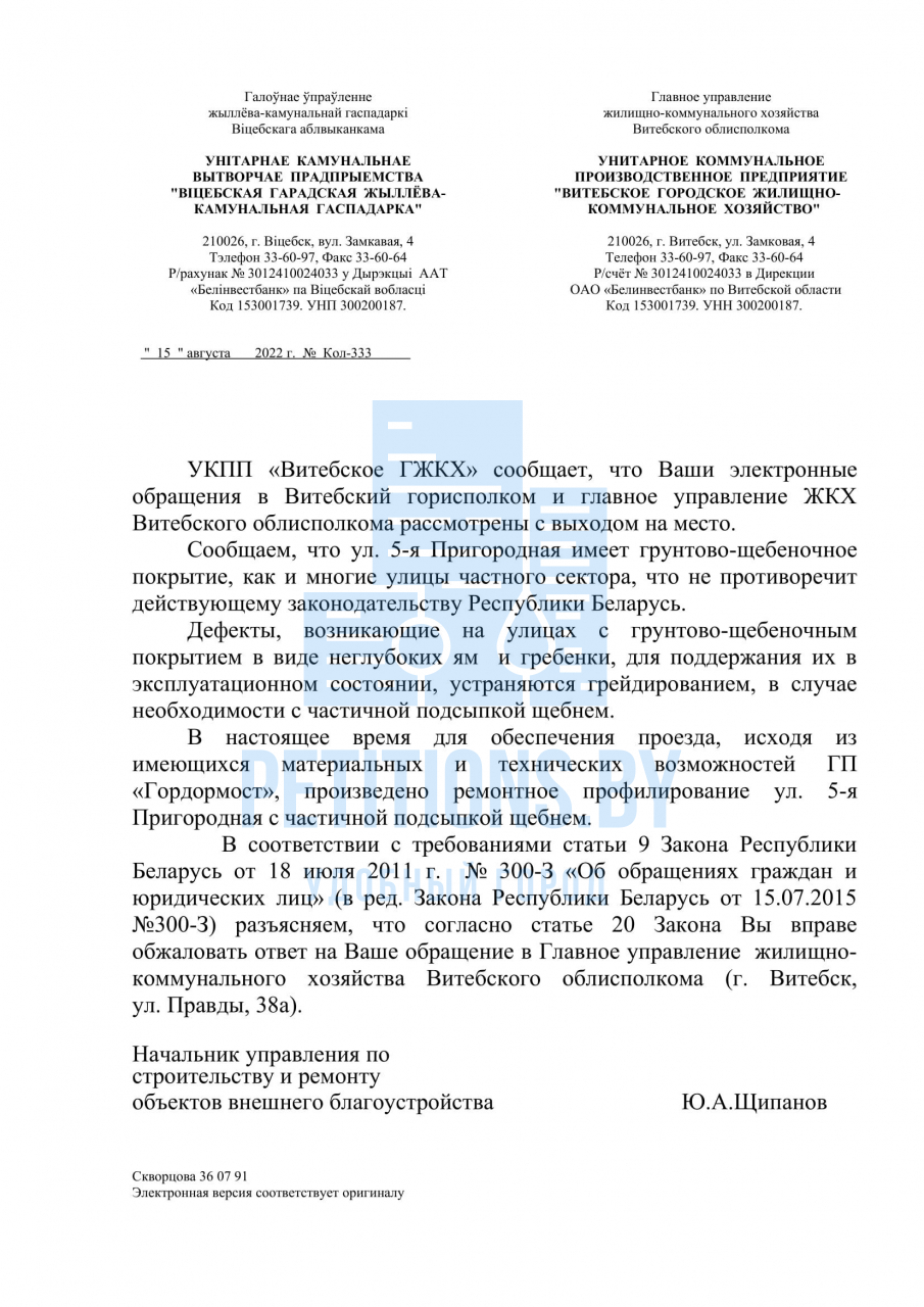 5-я Пригородная улица имеет грунтово-щебеночное покрытие, что не противоречит действующему законодательству Республики Беларусь. В настоящее время для обеспечения проезда, исходя из имеющихся материальных и технических возможностей ГП «Гордормост», произведено ремонтное профилирование ул. 5-я Пригородная с частичной подсыпкой щебнем.