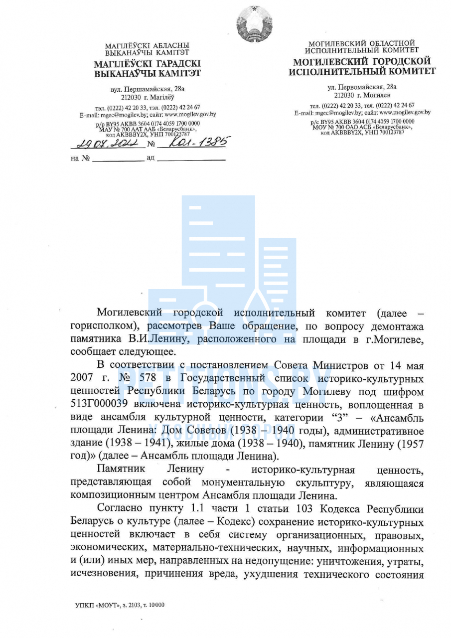 Мы, неравнодушные жители и гости города Могилёва, считаем, что памятник советского государственного деятеля В. И. Ленина, установленный на одноимённой площади, должен быть в срочном порядке демонтирован!