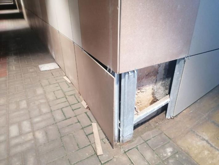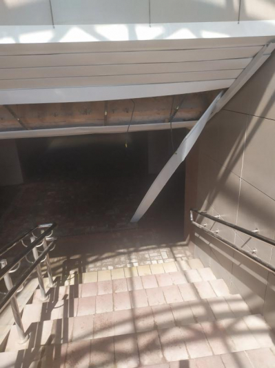 В подземном переходе, расположенном по пр.Строителей, возле телезавода «Витязь» (перекрёсток с ул.П.Бровки) в г.Витебске, потолок, выполненный из сайдинга, а также плиточное покрытие на стенах находятся в неудовлетворительном состоянии.