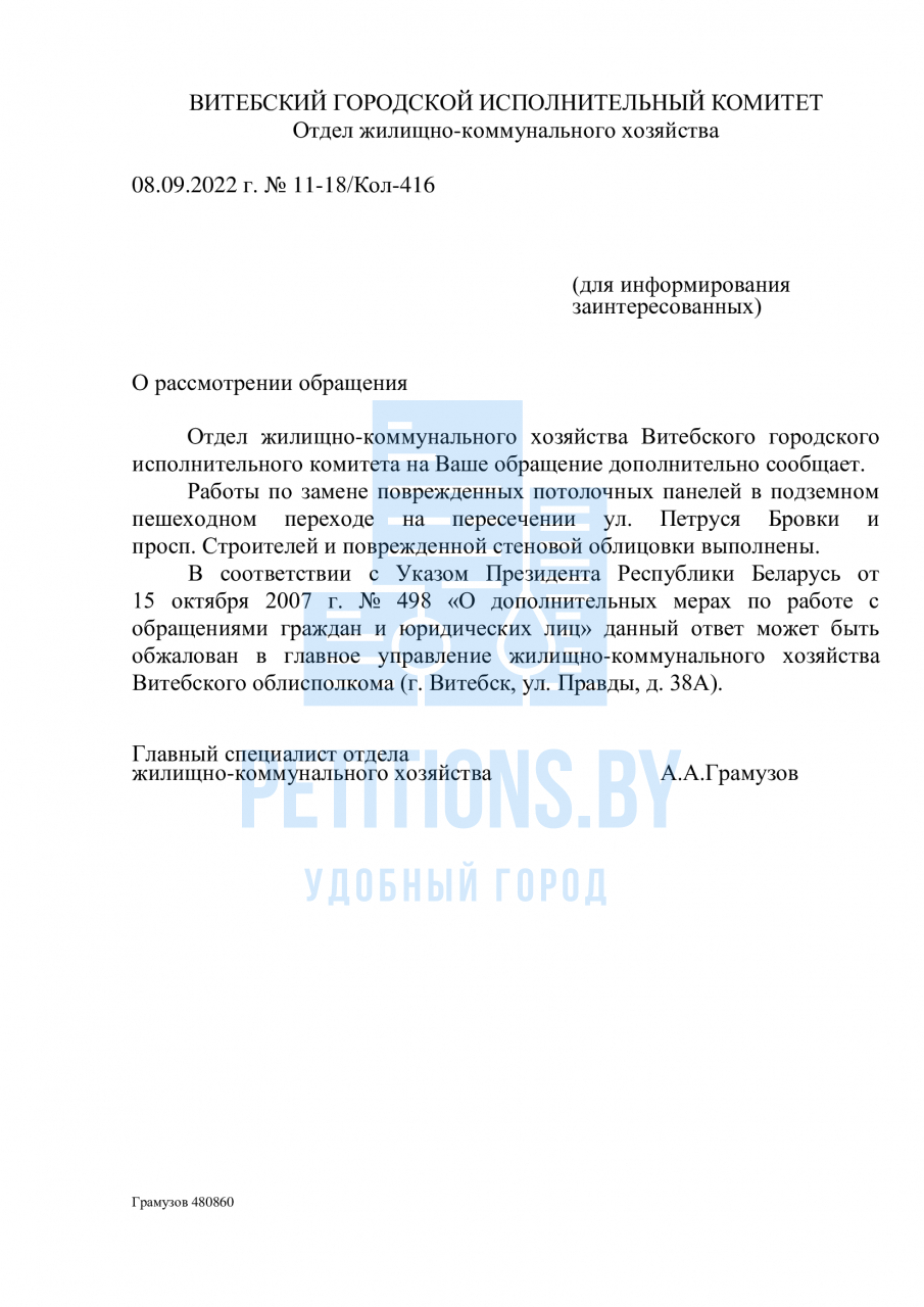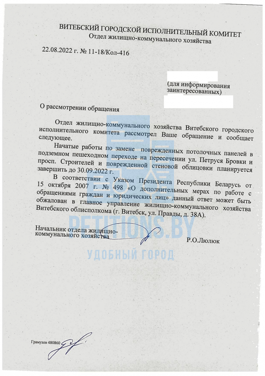 • провести проверку фактов неудовлетворительного состояния настенного и потолочного покрытия подземного перехода, указанного в обращении;