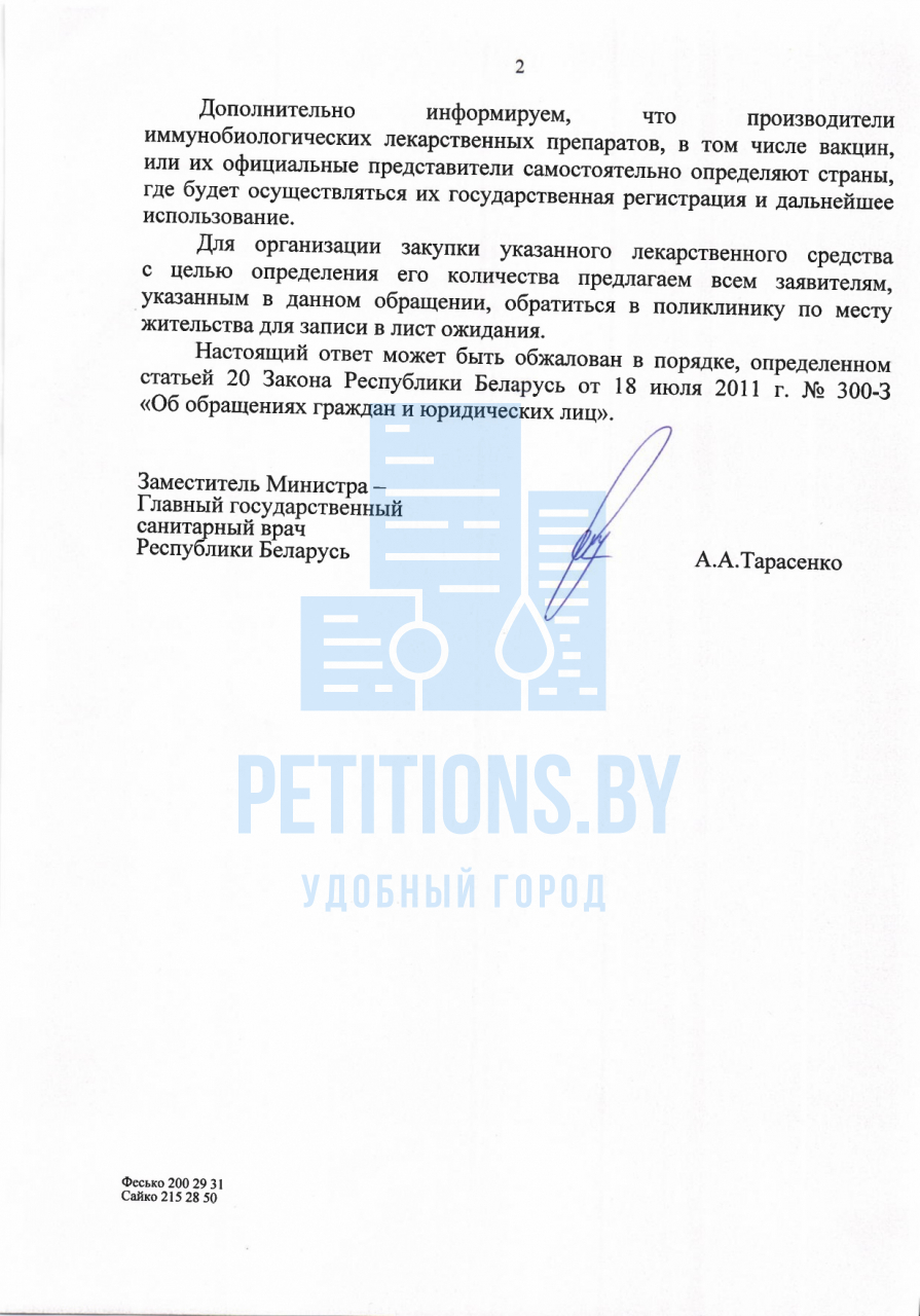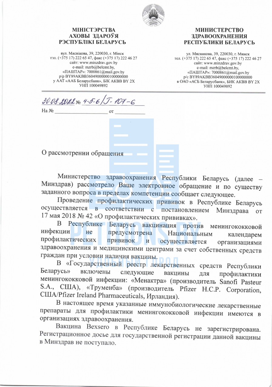 Мы считаем, что учет Министерством здравоохранения повышенного интереса родителей к вакцинации от менингококка группы В, а также его обращение к производителю вакцины Бексеро, компании GSK, чьи вакцины широко представлены на белорусском рынке, может способствовать скорейшей регистрации и появлению вакцины в Беларуси. Министерство также имеет полномочия выдать разрешение на ввоз незарегистрированных лекарственных средств (как это было с вакцинами Эупента, Хеалив до момента их регистрации), что может сделать возможным закупку у иных поставщиков.
