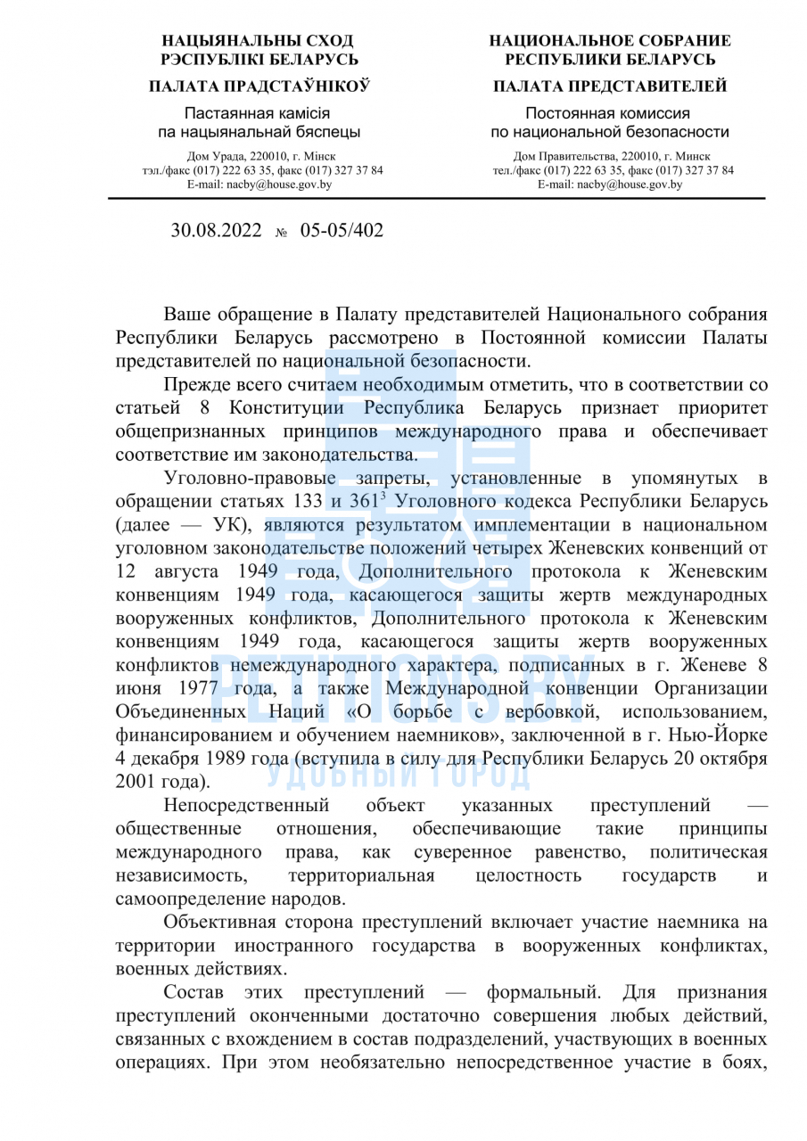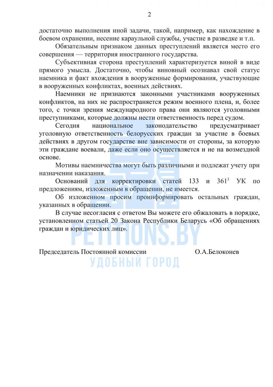 На основании вышесказанного, а также статьи 41 Закона «О нормативных правовых актах», просим инициировать вопрос о приведении УК РБ в соответствие с устоявшейся практикой применения статей 133 и 361/3 УК, и ввести исключение для привлечения к уголовной ответственности граждан Беларуси, воюющих на стороне ДНР/ЛНР в Украине - за наемничество и участие на территории иностранного государства в вооруженном формировании или вооруженном конфликте.
