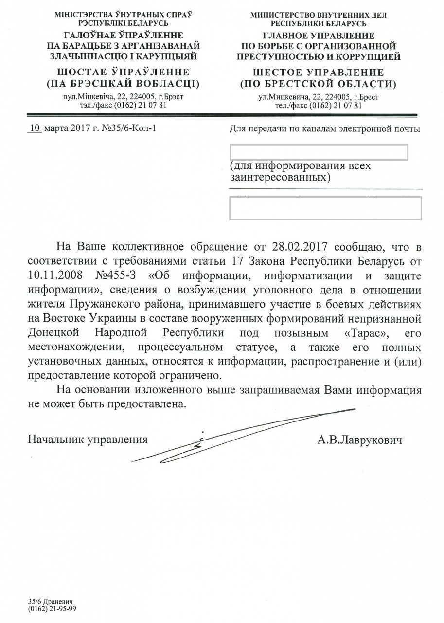 Начальник Пружанского РУВД Александр Гук уточнил в интервью газете «Наша Ніва», что задержанный воевал на стороне «Донецкой народной республики» http://nn.by/?c=ar&i=163266.