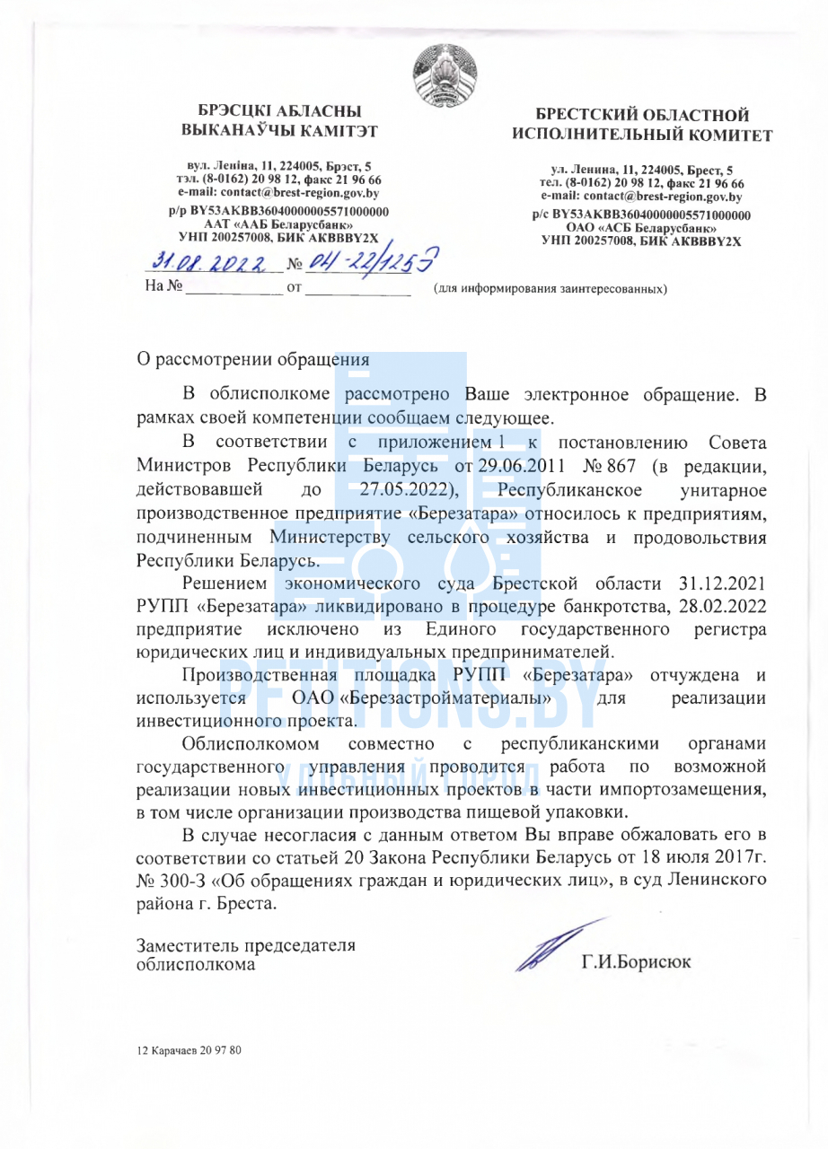 Таким образом, просим принять меры по восстановлению и организации производства пищевой упаковки на территории бывшего предприятия «Березатара».