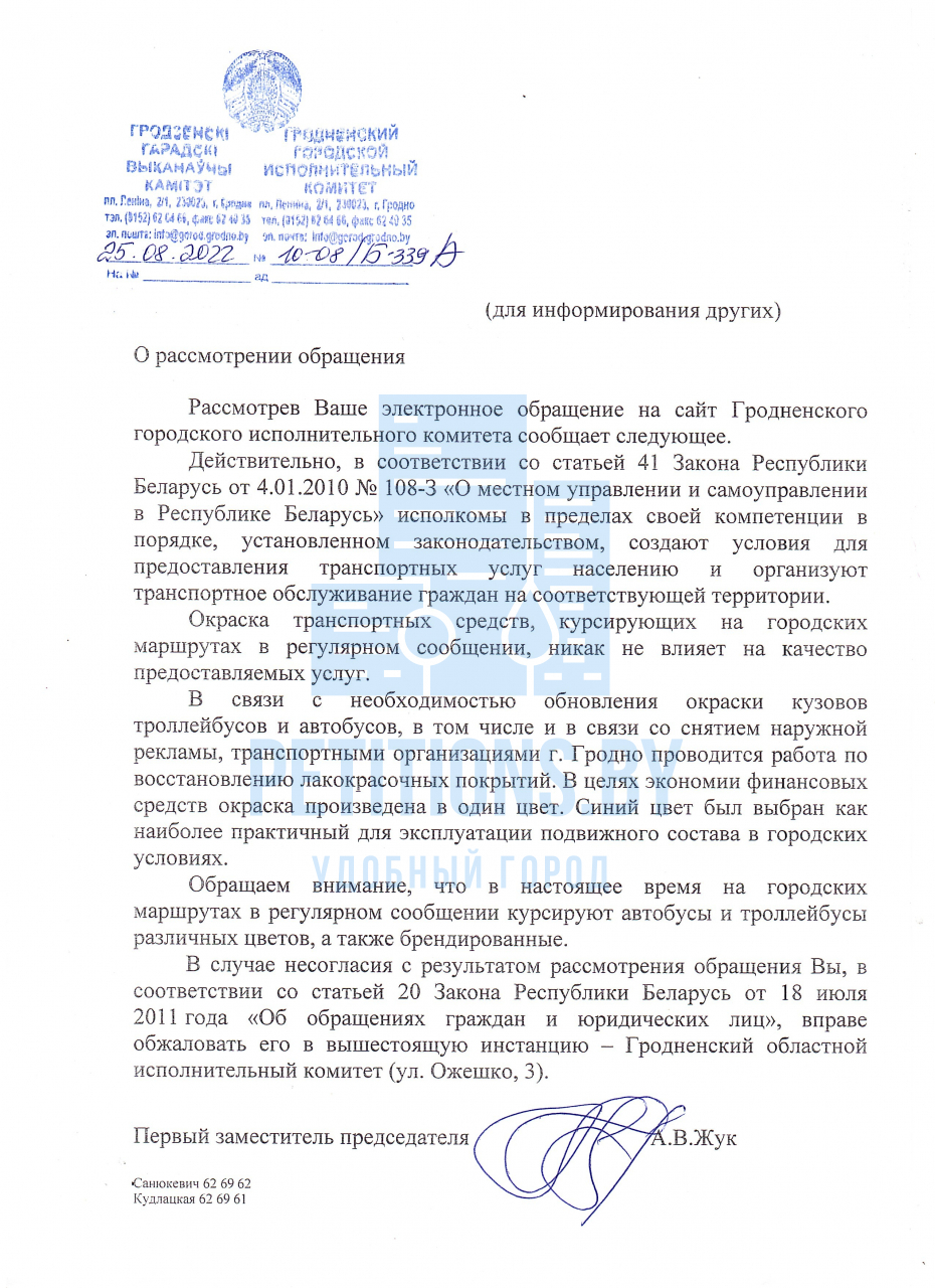 Мы, жители города Гродно и иные заинтересованные граждане, руководствуясь ст.41 Закона «О местном управлении и самоуправлении в Республике Беларусь», которая определяет, что исполкомы в пределах своей компетенции в порядке, установленном законодательством, создают условия для предоставления транспортных услуг населению и организуют транспортное обслуживание граждан на соответствующей территории, требуем вернуть яркий окрас городского транспорта, который был в прошлом - жёлто-синий в цвет герба и флага города Гродно.