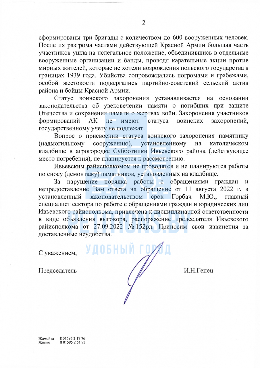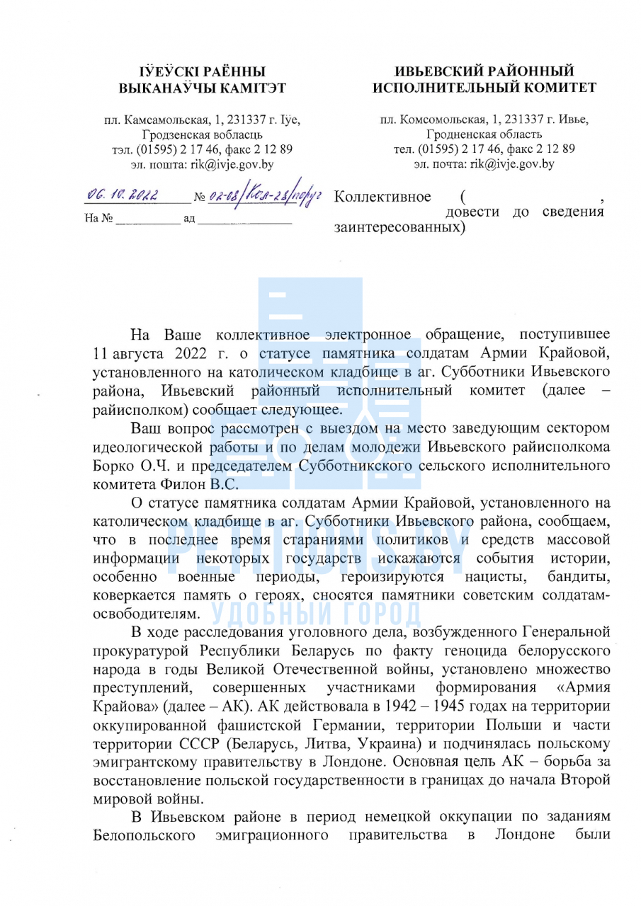 На основании вышесказанного просим пояснить:- имеет ли статус «воинского захоронения» памятник солдатам Арми Крайовой, установленный на католическом кладбище в агрогородке Субботники Ивьевского района? Если не имеет – рассмотреть вопрос о присвоении ему данного статуса во избежание необходимости сноса и разрешения в будущем памятника;- планируется ли райисполкомом проведение работ по демонтажу (разрушению) указанного памятника, и проведению перезахоронения останков солдат АК (при их наличии)?