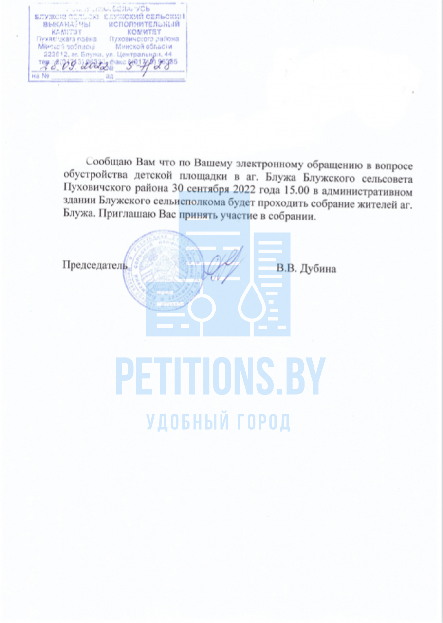 Таким образом, просим принять меры по оборудованию современной и безопасной детской площадки в агрогородке Блужа, Пуховического района, Минской области, за счёт средств местного бюджета.
