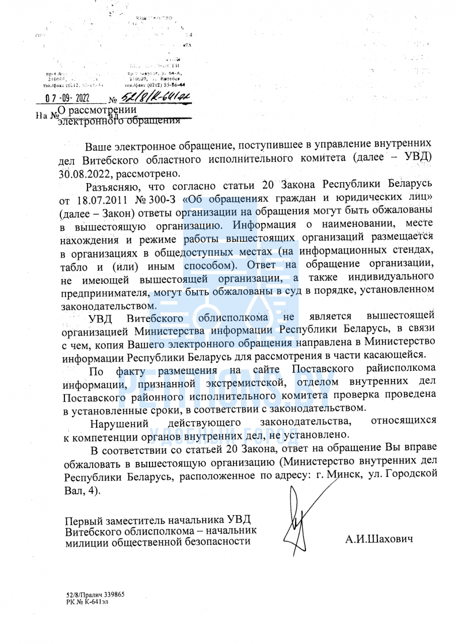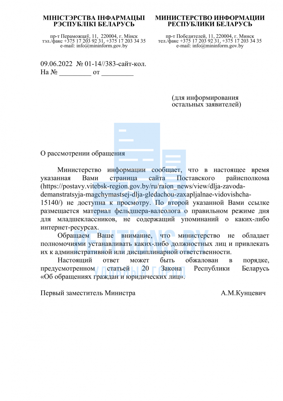 09 июня 2022 года получен ответ Министерства информации №01-14//383-сайт-кол на электронное обращение о размещение на сайте Поставского райисполкома ссылки на СМИ, признанное в Республике Беларусь экстремистским (копия прилагается). Указанный ответ считаем не соответствующим требованиям законодательства в части полного, всестороннего и объективного рассмотрения обращений и направления мотивированных и обоснованных ответов гражданам по следующим причинам.