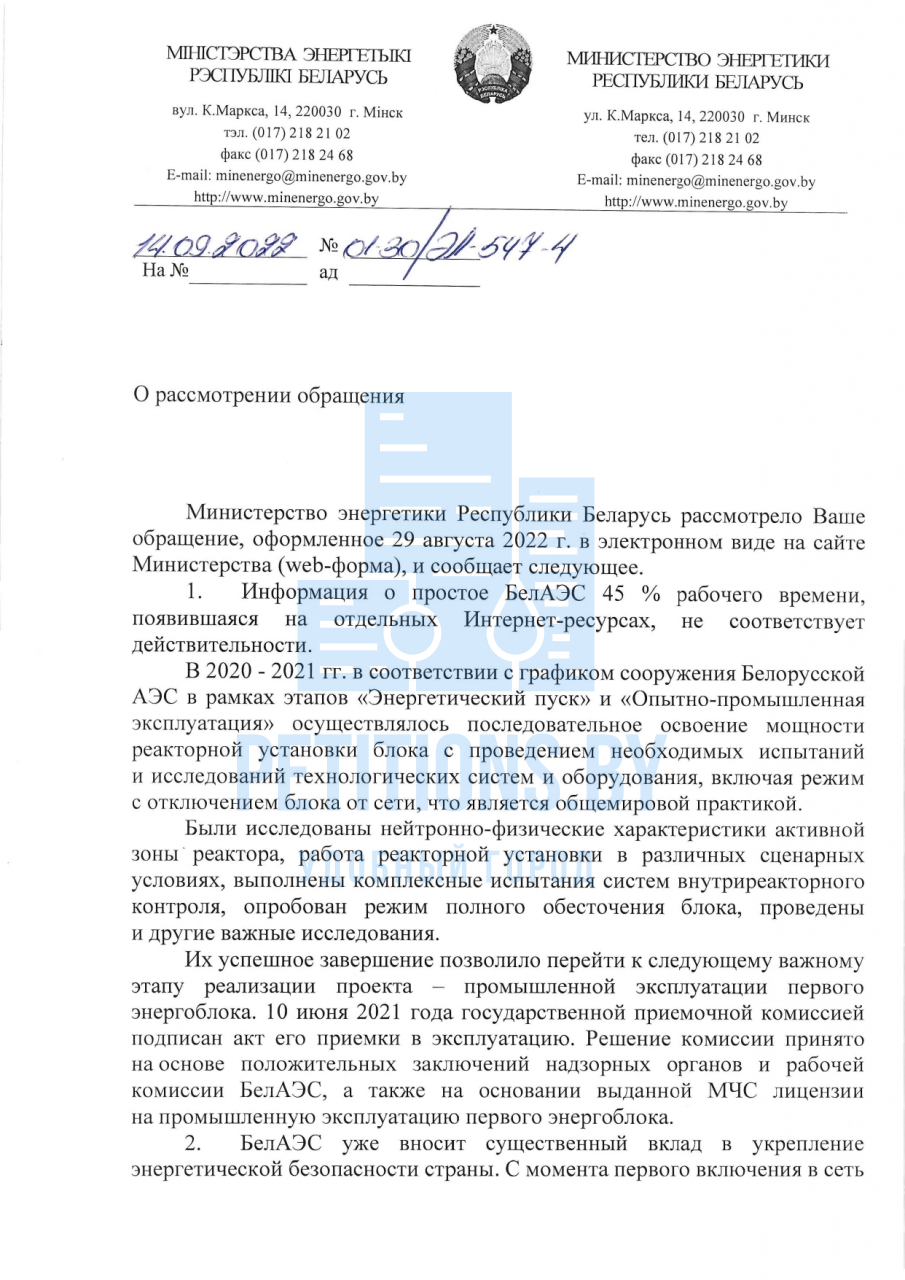 Согласно пункту 5.27 Положение о Министерстве энергетики Республики Беларусь, утв. постановлением Совета Министров Республики Беларусь от 31.10.2001 № 1595, Минэнерго в соответствии с возложенными на него задачами рассматривает в пределах своей компетенции в порядке, установленном законодательством, обращения (предложения, заявления, жалобы) граждан.