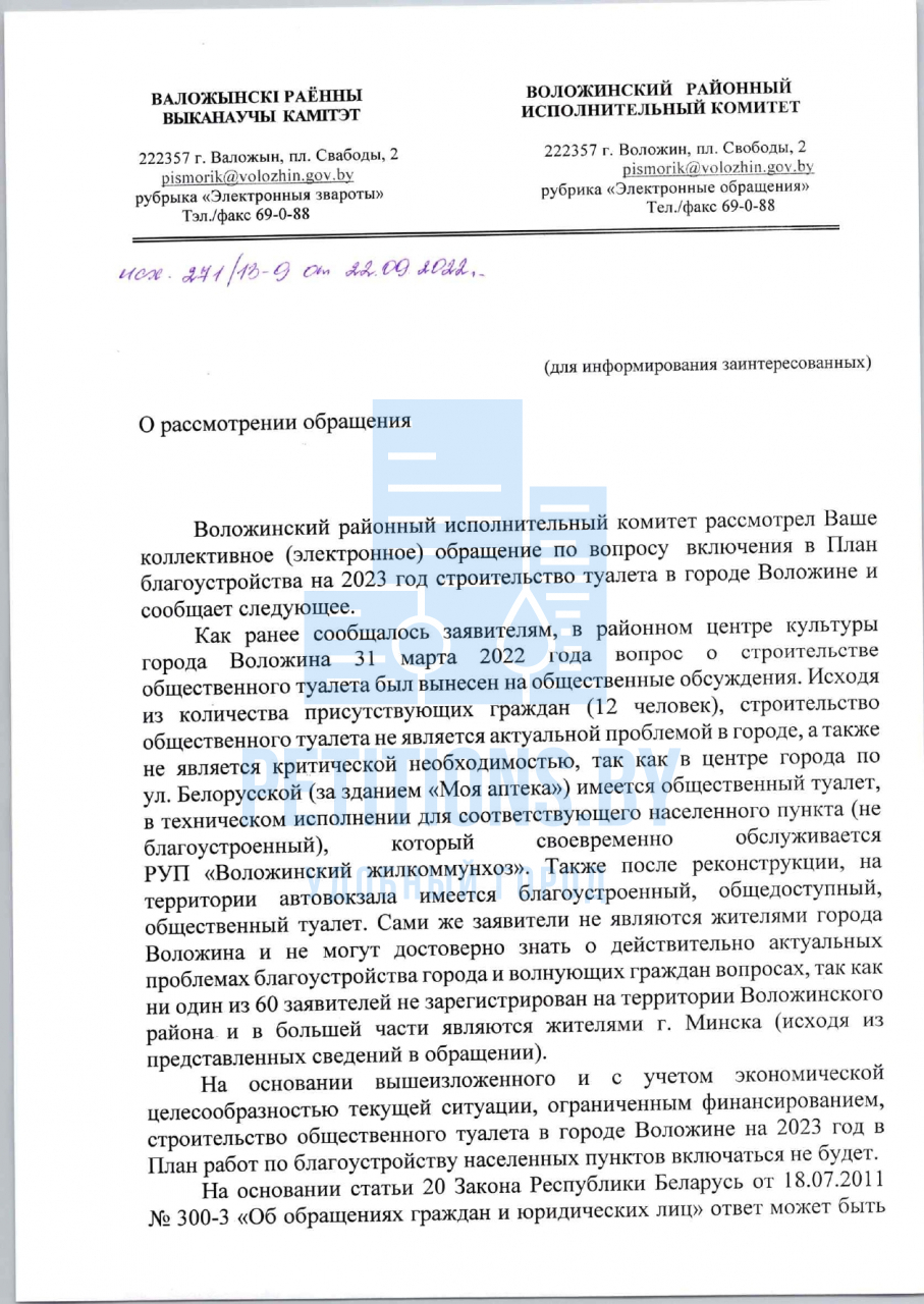 В письме Воложинского райисполкома от № 10/13-9 от 11.04.2022 сообщалось, что при формировании перечня работ по текущему содержанию и ремонту объектов благоустройства, улично-дорожной сети и наружного освещения в г.Воложин и Воложинском районе на 2023 год будет внесено предложение о целесообразности строительства нового общественного туалета в Воложине, а также выделение финансовых средств.