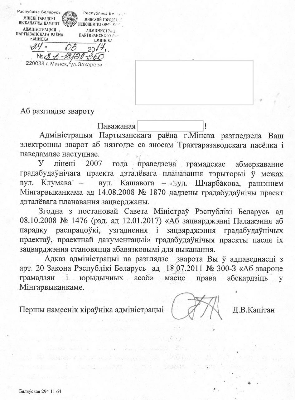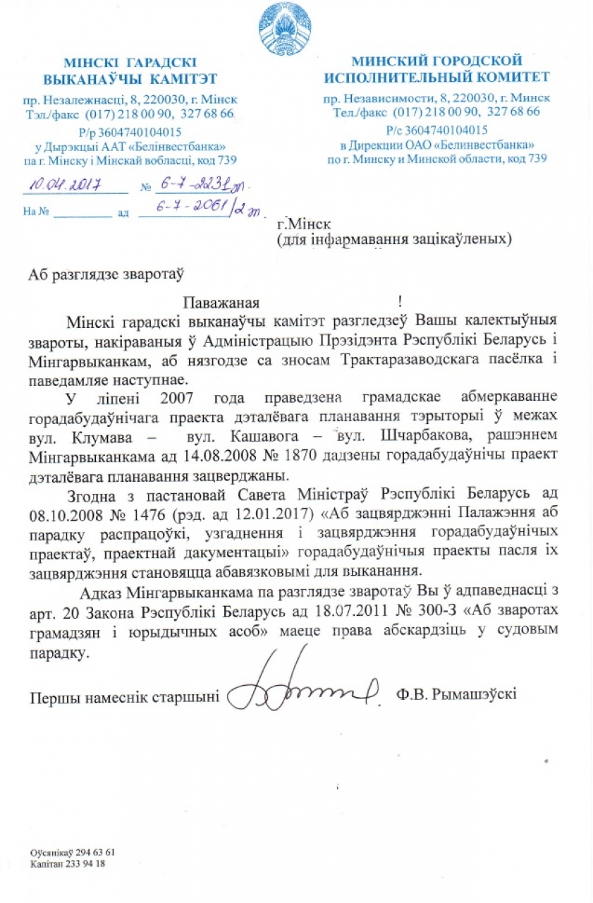 Просім перагледзець рашэнне Мінгарвыканкама аб зносе 2-павярховых дамоў жылога пасёлка Мінскага Трактарнага завода (найперш - дзесяці адселеных дамоў у межах вуліц Чабатарова, Шчарбакова, Клумава, Стаханаўскай).