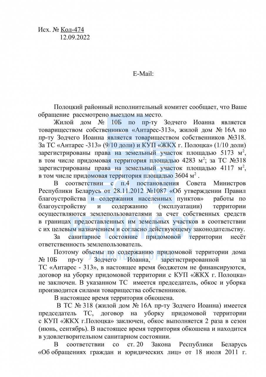 Объёмы по содержанию придомовой территории дома №10Б на пр-те Зодчего Иоанна, зарегистрированной за ТС «Антарес-313», в настоящее время бюджетом не финансируются, договор на уборку придомовой территории с КУП «ЖКХ г.Полоцка» не заключён. В указанном ТС имеется председатель, обкос и уборка производится силами товарищества собственников.
