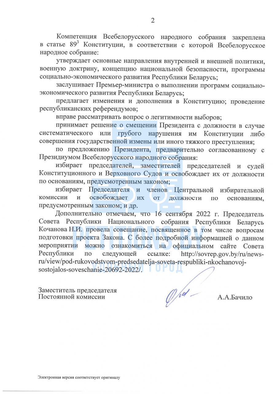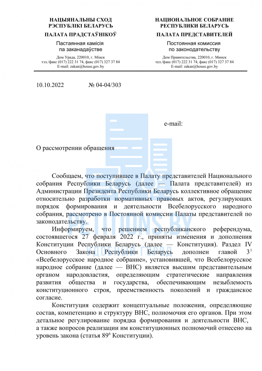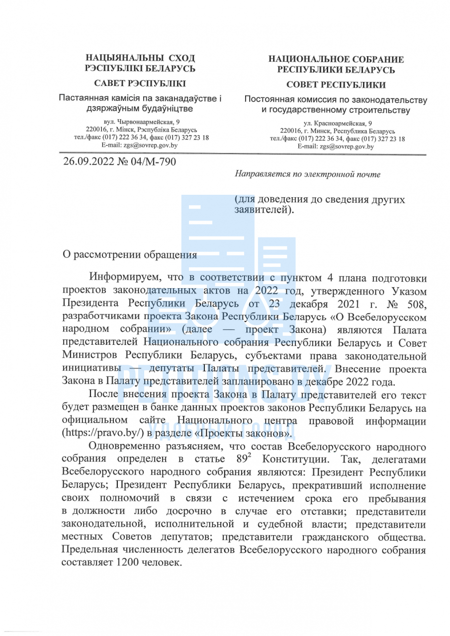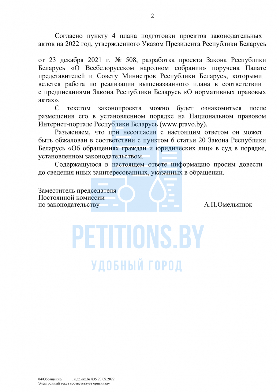 Разработка проекта Закона «О Всебелорусском народном собрании» поручена Палате представителей и Совету Министров Республики Беларусь, которыми ведется работа по реализации вышеназванного плана в соответствии с предписаниями Закона «О нормативных правовых актах». С текстом законопроекта можно будет ознакомиться после размещения его в установленном порядке на Национальном правовом Интернет-портале Республики Беларусь (www.pravo.by).