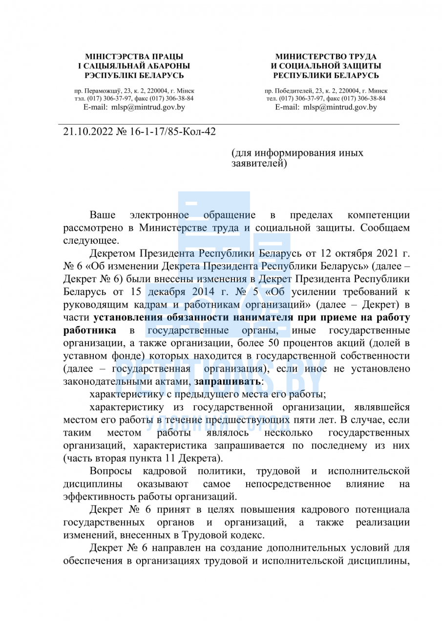 Требования Декрета Президента Республики Беларусь от 12 октября 2021 г. №6 ˮОб изменении Декрета Президента Республики Беларусь“, который предусматривает внесение изменений в Декрет Президента Республики Беларусь от 15 декабря 2014 г. №5 ˮОб усилении требований к руководящим кадрам и работникам организаций“, в частности устанавливает дополнительные требования при приёме на работу в государственные органы, государственные организации и организации, более 50 процентов акций (долей в уставном фонде) которых находится в государственной собственности (государственные организации), а именно обязывает соискателя предоставить характеристику с предыдущего места работы, полагаем, дискриминируют граждан и нарушают их конституционные права на труд и невмешательство в частную жизнь.