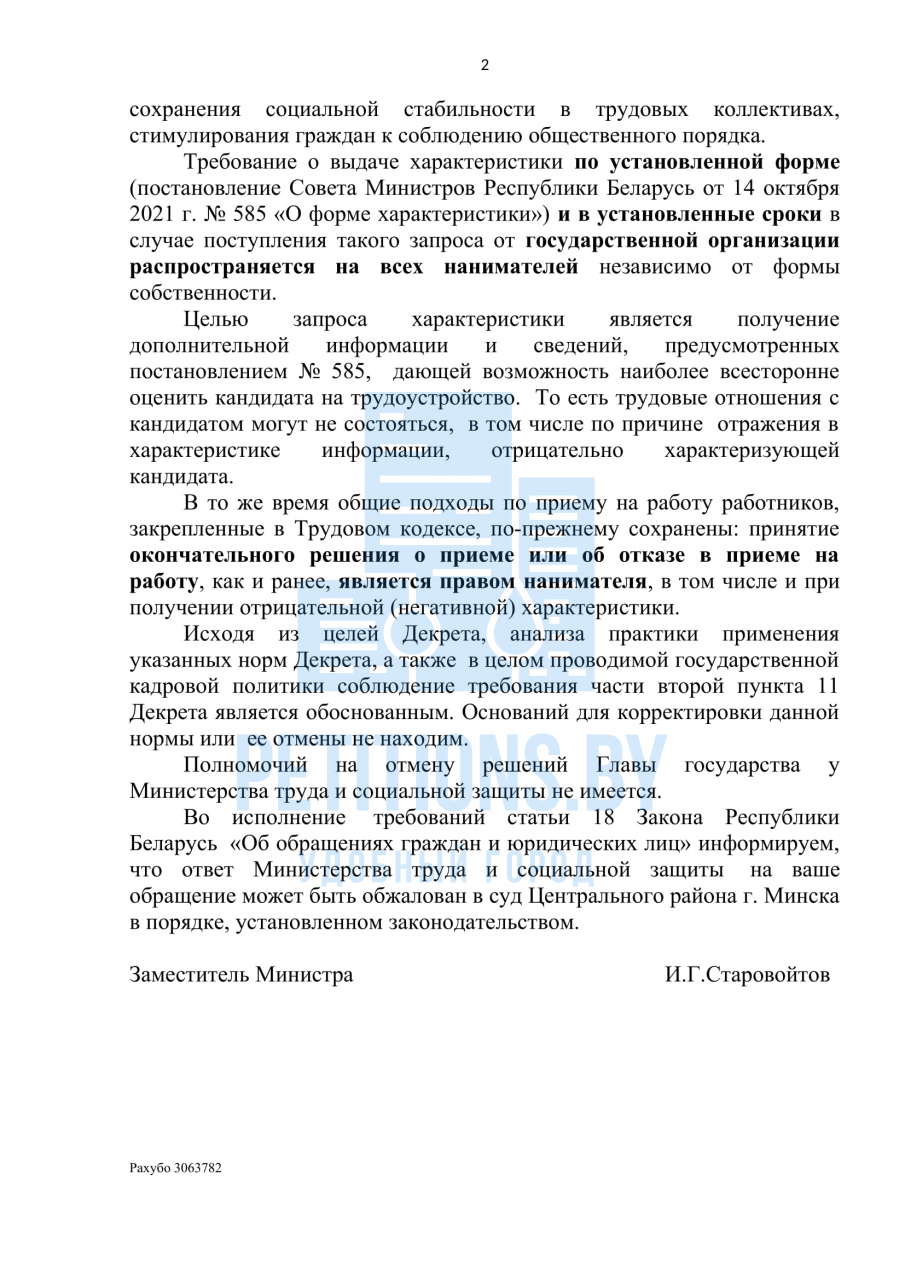 На основании изложенного требуем отменить обязательное требование о предоставлении характеристики при приёме на работу в государственные органы, государственные организации и организации, более 50 процентов акций (долей в уставном фонде) которых находится в государственной собственности, установленные Декретом Президента Республики Беларусь от 12 октября 2021 г. №6 ˮОб изменении Декрета Президента Республики Беларусь“, а также требования к форме указанной характеристики, утверждённые постановлением Совета Министров Республики Беларусь от 14 октября 2021 г. №585 ˮО форме характеристики“.