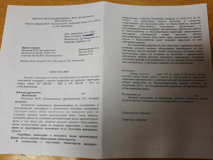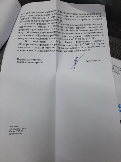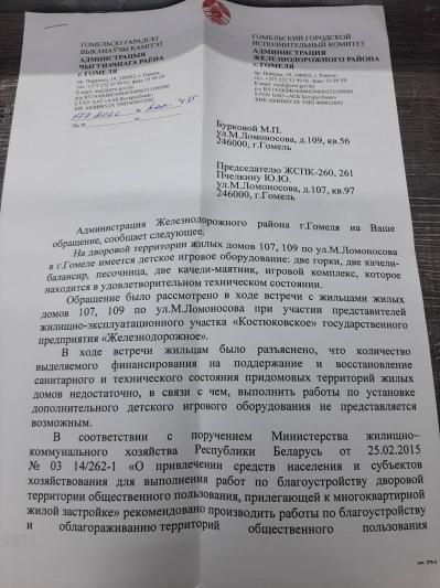 администрацию Железнодорожного района г. Гомеля, на что получили отрицательный ответ в связи с отсутствием финансирования и предложение установить площадку за счет собственных средств жильцов.