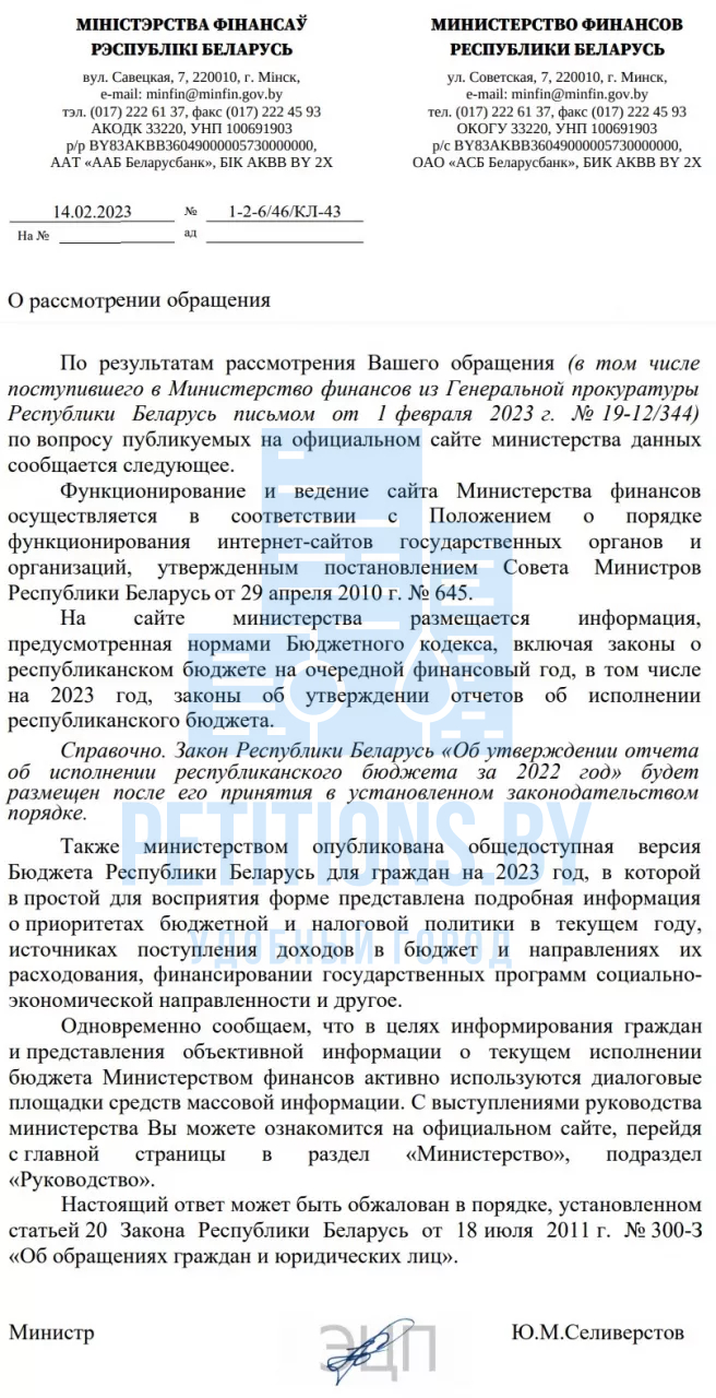 - дать правовую оценку действиям должностных лиц Министерства финансов, которые не обеспечили распространение официальной о бюджетной открытости, не относящейся к информации, распространение которой ограничено;- на основании ст.27, 38, 41 и 42 Закона Республики Беларусь от 08.05.2007 № 220-З «О прокуратуре Республики Беларусь»