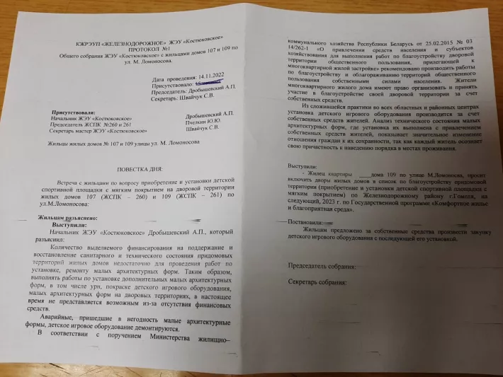 Установленная на данный момент детская площадка на территории ЖЭУ «Костюковское» и КЖРУП «Железнодорожное» во дворе домов № 109 и № 107 относится к имуществу членов ЖСПК № 260, жильцов дома № 107, так как приобретение и установка игрового оборудования для детской