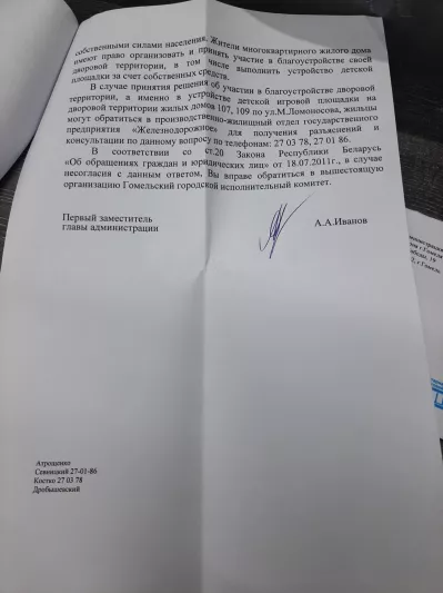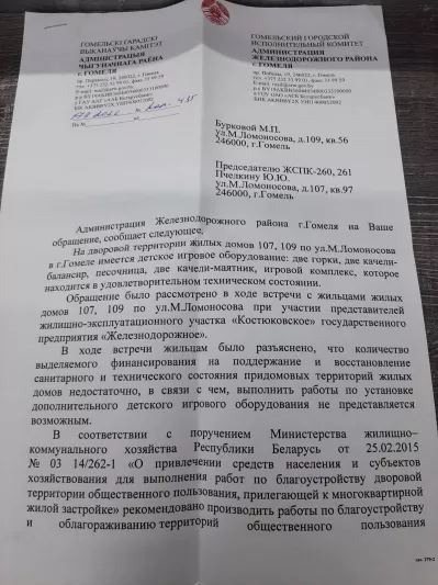 Мы обратились с просьбой об установке игровой площадки в администрацию Железнодорожного района г. Гомеля, на что получили отрицательный ответ в связи с отсутствием финансирования.