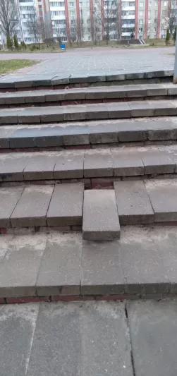 2) отремонтировать лестницы в сквере. На некоторых лестницах ступеньки не закреплены. Каменная плитка на некоторых ступеньках просто лежит (не закреплена раствором) и при наступании на неё ногой падает, что не безопастно для пешеходов.