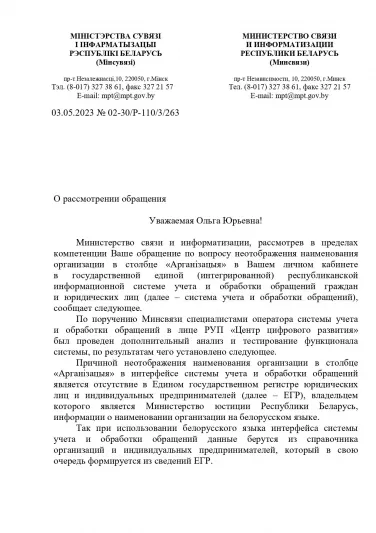 После появления новой системы учета и обработки обращений (обращения.бел) выяснилось существование следующей практики дискриминации граждан по языковому признаку со стороны Министерства юстиции. В системе обращений данные о наименовании государственных органов и иных государственных организаций, в которые можно подать обращения, берутся из справочника организаций и индивидуальных предпринимателей, который в свою очередь формируется из сведений Единого государственного регистра юридических лиц и индивидуальных предпринимателей (далее – ЕГР), владельцем которого является Министерство юстиции. Как оказалось, в ЕГР отсутствует информация о наименовании на белорусском языке государственных органов и государственных юридических лиц, положения о которых утверждены актами законодательства. И как следствие, в беларуском интерфейсе системы обращений раньше это приводило к отсутствию наименования организации в столбце «Арганізацыя» таблицы со списком всех поданных обращений, сейчас наименования таких организаций отображаются только на русском языке. Это создает препятствия и ограничения в использовании беларуского языка на беларуской версии сайта системы обращений. А также при получении из ЕГР сведений о государственных органах и государственных юридических лицах.