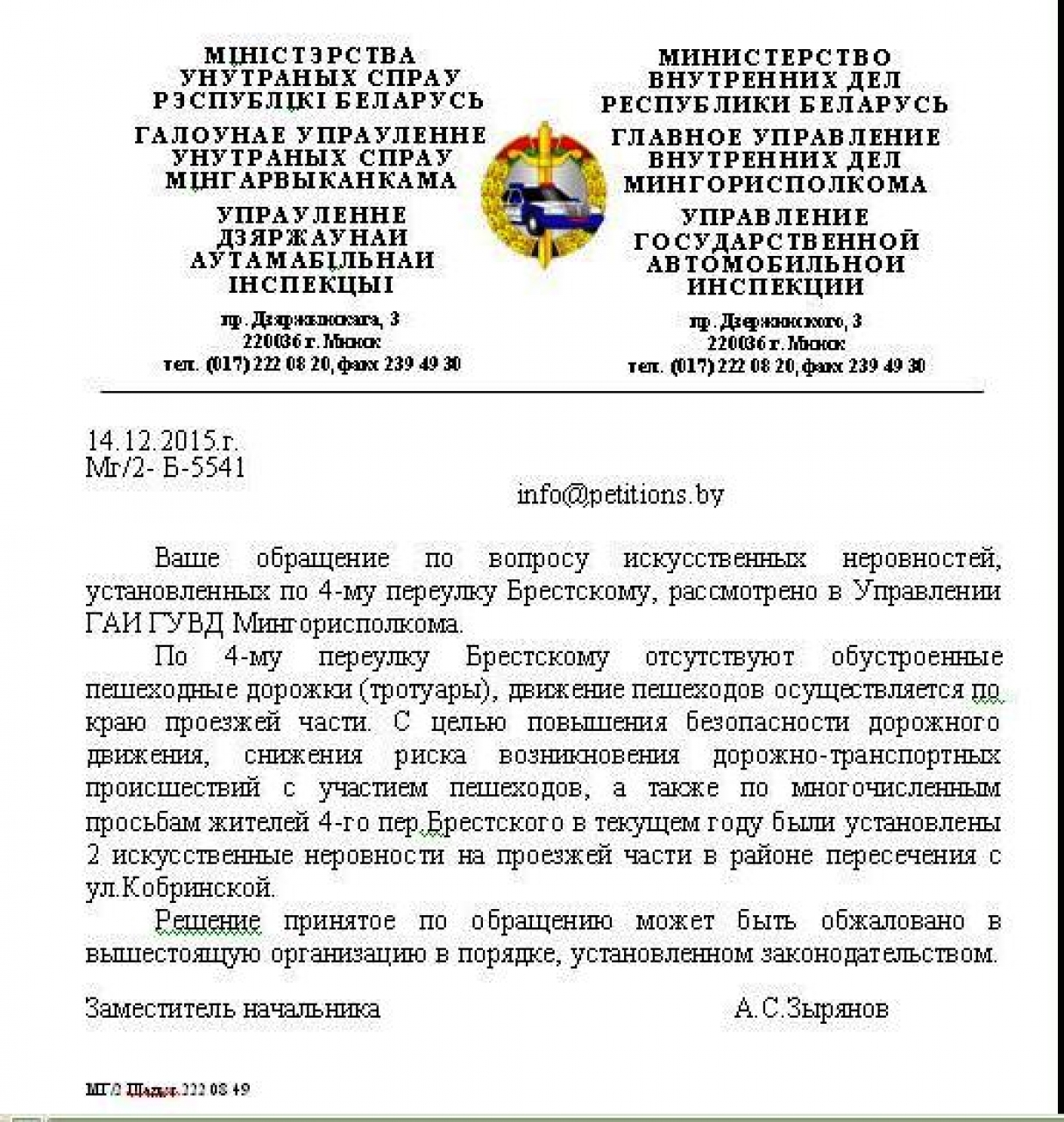 1. Проинформировать об обстоятельствах, послуживших основаниями для устройства искусственных неровностей на 4-м Брестском переулке в г.Минске;