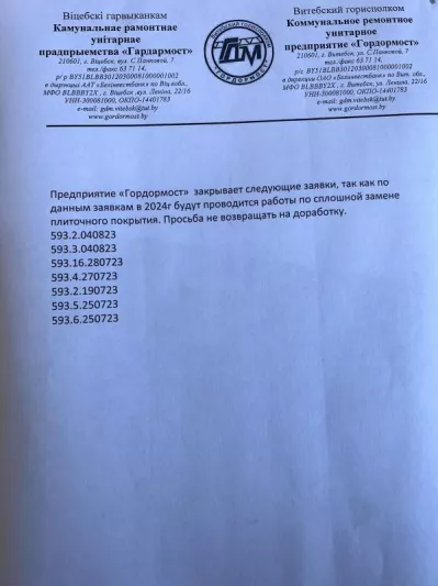 Усе яны былі закрыты без рамонту з абяцаннем заняцца рамонтам ў 2024 годзе. Тэкст адказу па некаторым з іх прыкладваем да звароту. Старшыня Віцебскага гарвыканкама Генадзь Сабыніч, які нядаўна ўступіў на пасаду, даў 24 лістапада 2023 года першае інтэрв'ю гарадской газеце «Віцьбічы» і распавёў пра пераўтварэнні, якія чакаюць абласны цэнтр. Сярод іншага ён закрануў і тэму рамонту на некаторых вуліцах з праблемай пліткавага пакрыцця. Але чытачы звярнулі ўвагу, што пазначаныя толькі дзве вуліцы (Суворава і Талстога) і Успенская плошча з тых, што маюць вышэй пазначанаю праблему.