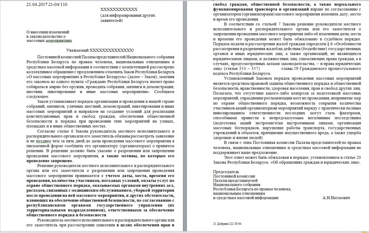 Считаем необходимым отменить антиконституционный закон "О МАССОВЫХ МЕРОПРИЯТИЯХ В РЕСПУБЛИКЕ БЕЛАРУСЬ". Вместо него ввести закон, содержащий один пункт: "Граждане Республики Беларусь имеют право собираться мирно без оружия, проводить собрания, митинги и демонстрации, шествия, пикетирование и иные массовые мероприятия".