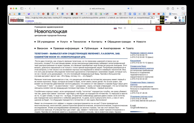 В январе 2024 была направлена петиция в управление по здравоохранению Витебского облисполкома, в связи с публикацией на сайте учреждения здравоохранения Новополоцкой центральной городской больницы статьи под авторством заведующей кабинетом формирования здорового образа жизни (ФЗОЖ) Л.А.Бобрук о телегонии у человека.(прилагается скриншот удаленной статьи)