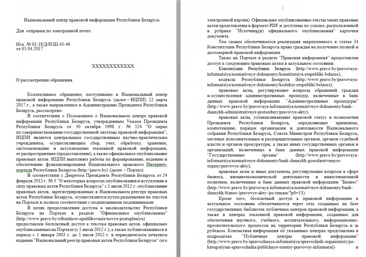Считаем, что отсутствие возможности доступа к актуальным текстам правовых актов нарушает наши права, изложенные в Статье 34 Конституции Республики Беларусь, и препятствует выполнению обязательств по соблюдению законов РБ, закрепленную Статьей 52 Конституции Республики Беларусь.