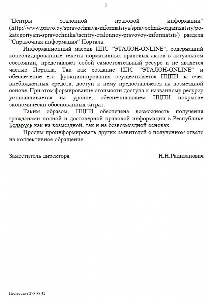 Просим обеспечить бесплатный доступ к актуальным текстам правовых актов на Национальном правовом Интернет-портале Республики Беларусь (http://www.pravo.by) или к Эталонному банку данных правовой информации (электронная база данных «Эталон»).