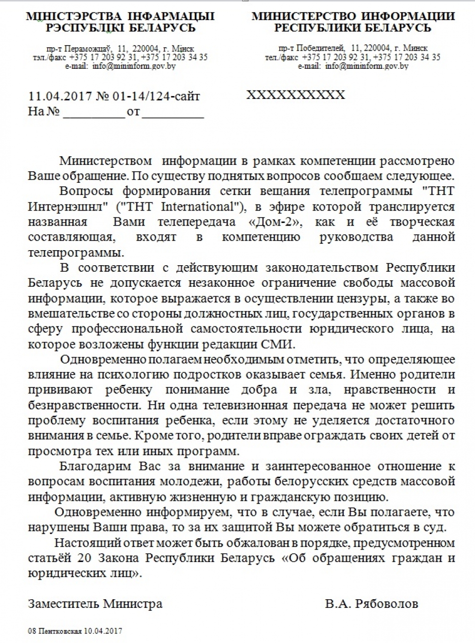 Учитывая изложенное выше, требуем запретить трансляцию реалити-шоу "Дом-2" на территории Республики Беларусь.
