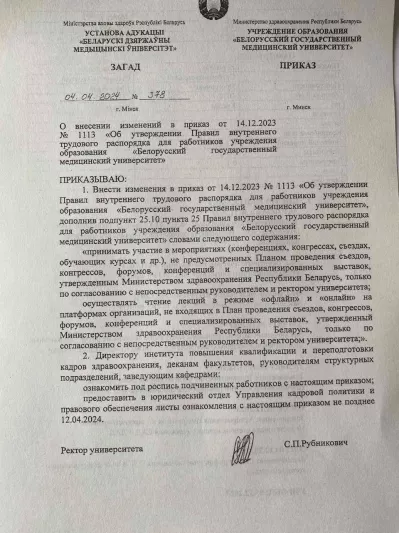 Ректор Беларуского государственного медицинского университета Сергей Рубникович изменил правила внутреннего трудового распорядка в университете приказом №378 от 04.04.2024. Теперь сотрудники университета не могут участвовать в конференциях, съездах, обучающих курсах и т.д., не предусмотренных планом, утвержденным Минздравом. Делать это можно только по «спецразрешению». То же касается и чтения лекций в онлайн и офлайн режиме — сотрудники университета могут проводить их только по согласованию с непосредственным руководителем и ректором.