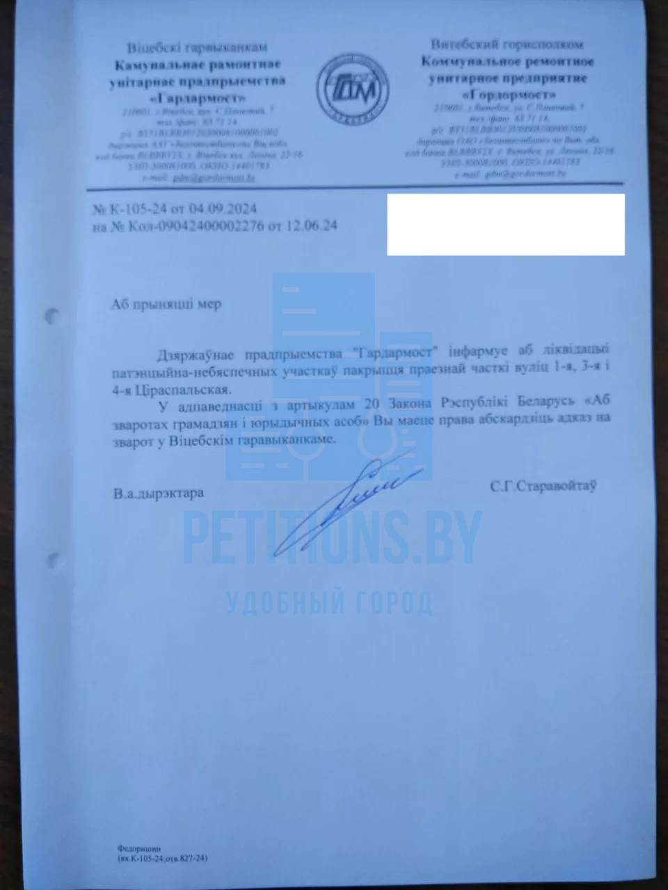 Обращение в Коммунальное ремонтное унитарное предприятие "Гордормост".
