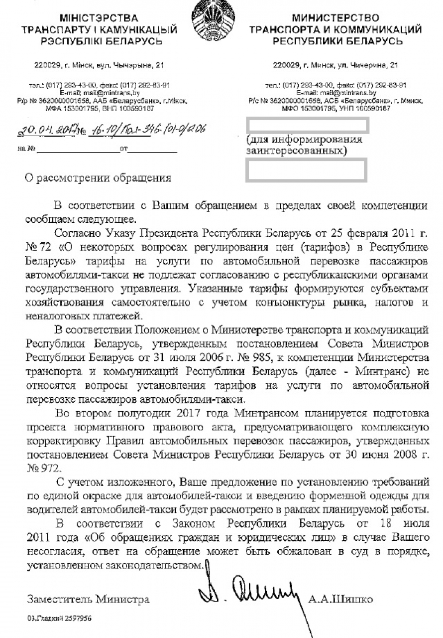 Госорганы не вправе вмешиваться в формирование рыночных цен. Вопрос о единообразии цвета и униформы для такси будет рассмотрен при корректировке Правил автомобильных перевозок.