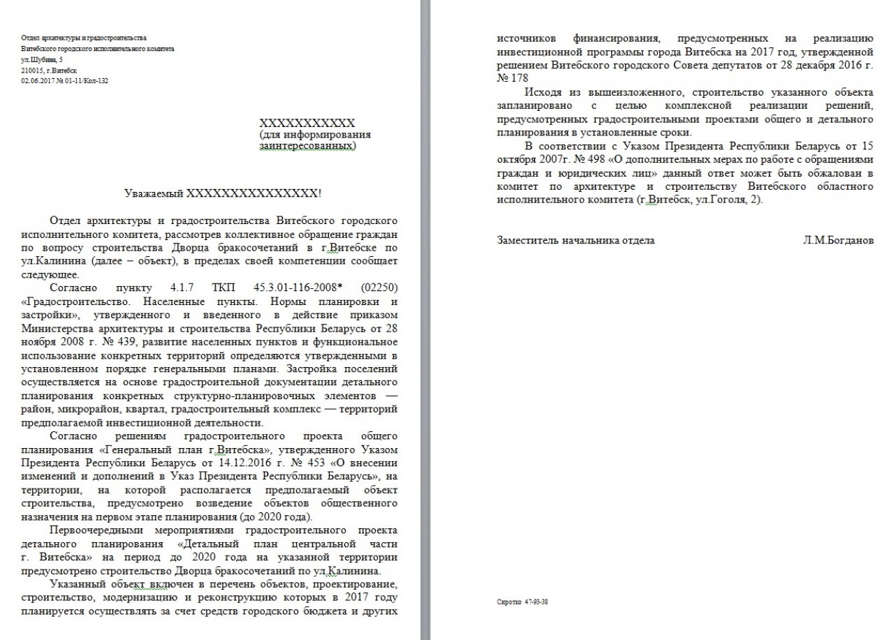 Мы, жители города Витебска, требуем прекратить бездумные траты бюджетных средств на ненужные, в сегодняшнее кризисное время, нашему городу объекты. Предлагаем вместо анонсированного строительства Дворца бракосочетания направить средства на объекты, действительно необходимые городу. Например, строительство поликлиники в микрорайоне ЮГ-7, ремонт инфекционной больницы, строительство новой дороги в Билево или реконструкцию улицы Гагарина.