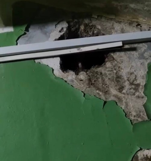 В настоящее время продолжается течь ливневой канализации внутри здания. На лестничных пролетах и стенах образовались трещины и сколы, застарелые разводы от воды. В подъезде сыро, накапливается вода. Фото прилагаем.