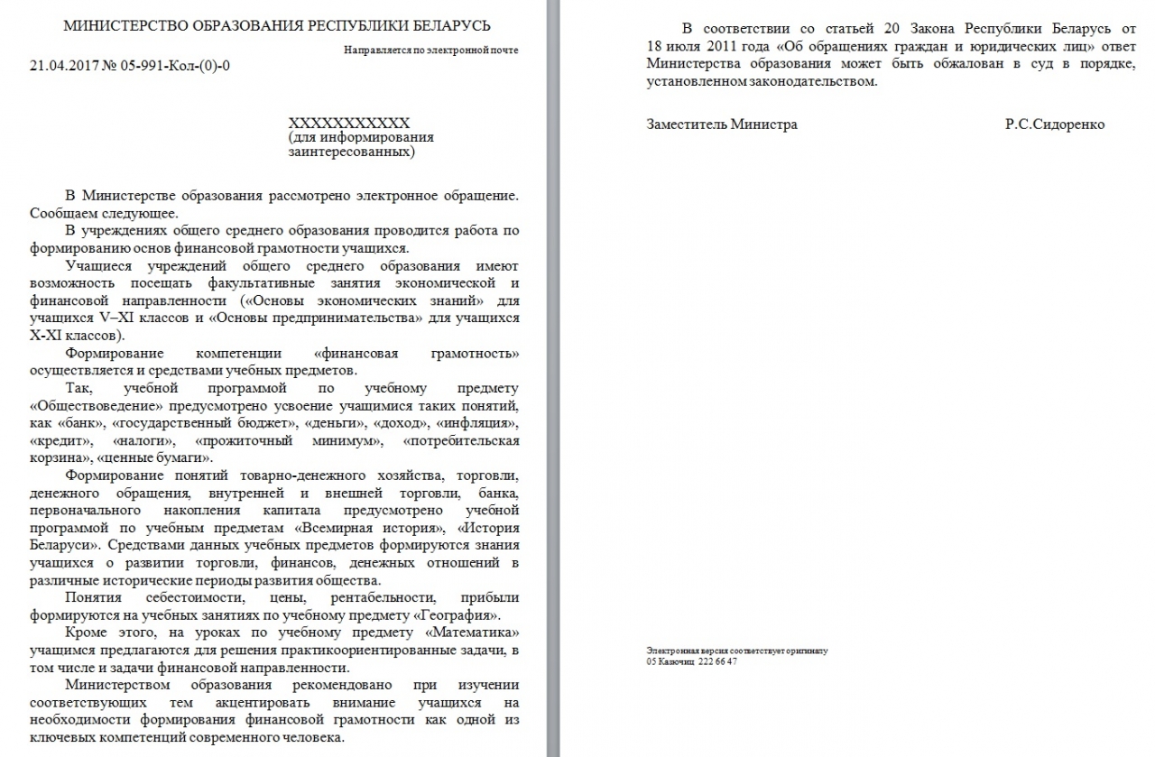 Просим рассмотреть предложение о введении во всех общеобразовательных школах Республики Беларусь дополнительного урока о финансовой грамотности! Эта тема играет весомую роль в жизни каждого человека.