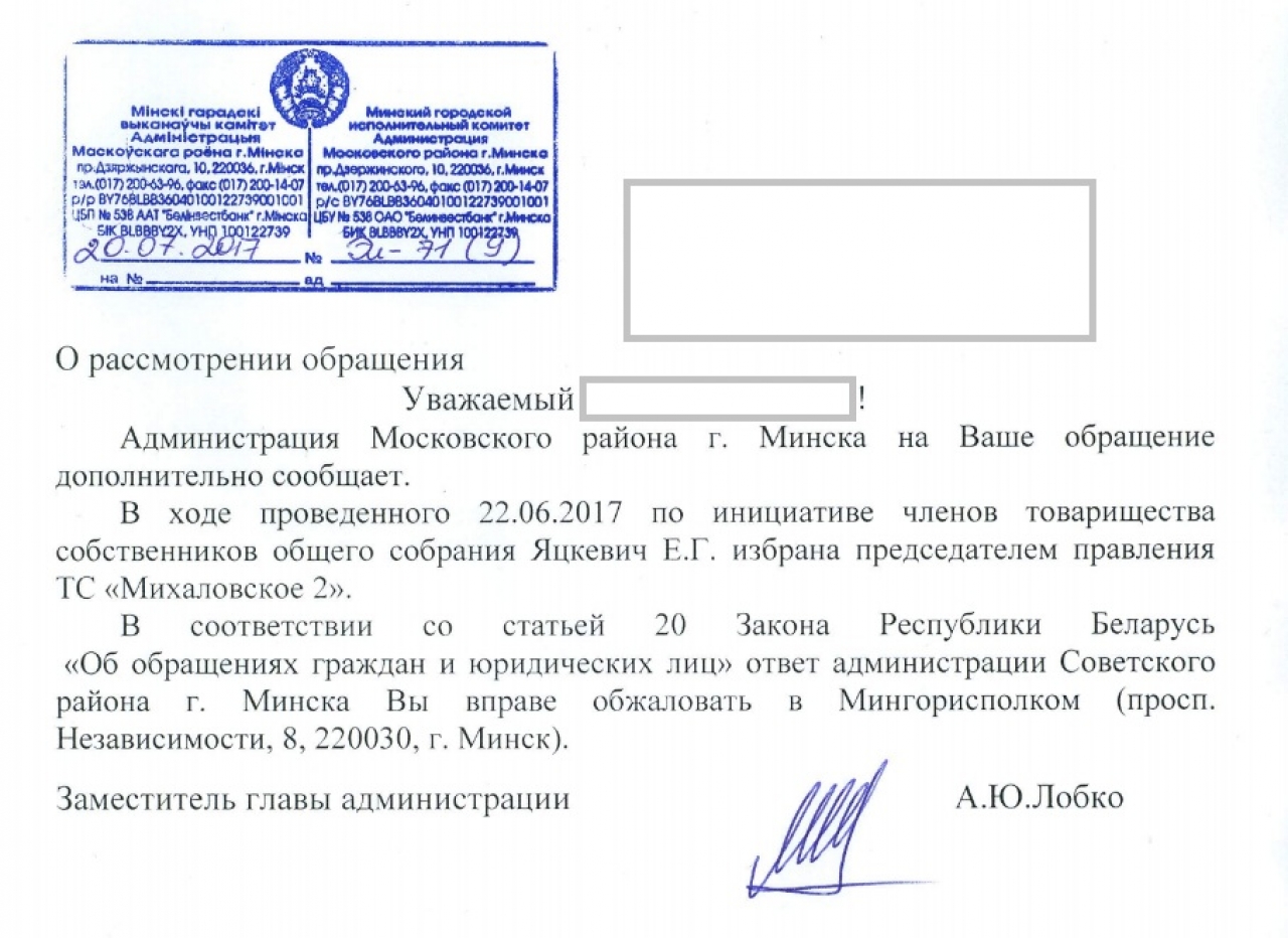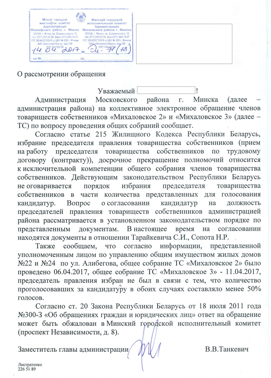 Считаем что при избрании председателя правления в ТС "Михаловское 2" и ТС "Михаловское 3" (дома 22 и 24 по ул. Алибегова в г. Минске) уполномоченным лицом, КУП «ЖКХ №1 Московского района г.Минска», нарушены права собственников, выборы должны быть альтернативные, в которых участвует несколько кандидатов. Принцип альтернативности выборов является одним из основных демократических стандартов и гарантируется законодательством демократических государств. При этом гарантии могут заключаться не только в обеспечении равенства кандидатов, но и в прямом требовании их множества, наличия альтернативы у собственников. Предлагаем привлечь альтернативного кандидата т.к. имеющийся кандидат от застройщика не представляет интересы остальных собственников товарищества. До представления альтернативного кандидата просим считать выборы недействительными в связи с отсутствием выбора.
