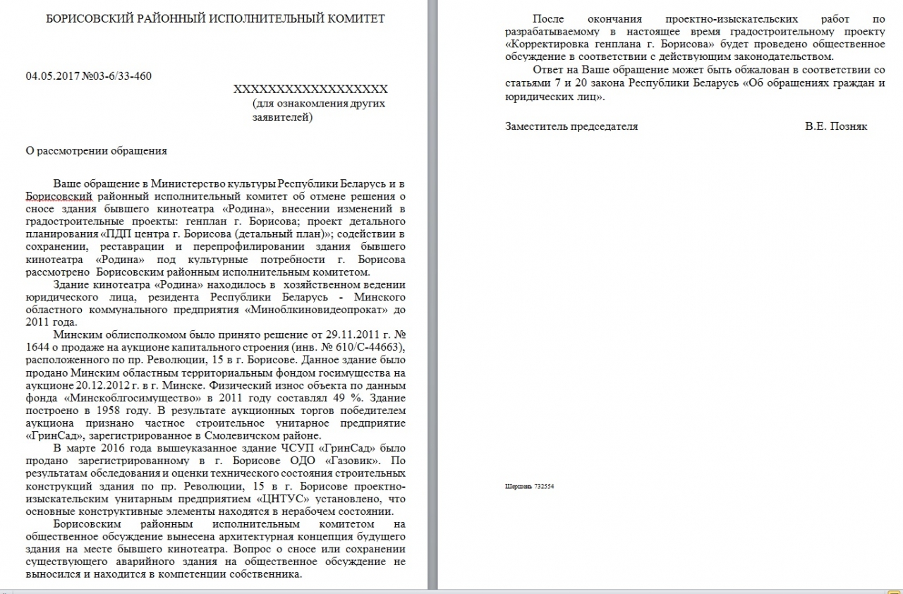 Борисове со сносом существующего здания кинотеатра «Родина» (объект 30/16, разработчик ООО «СТ-Проект»).