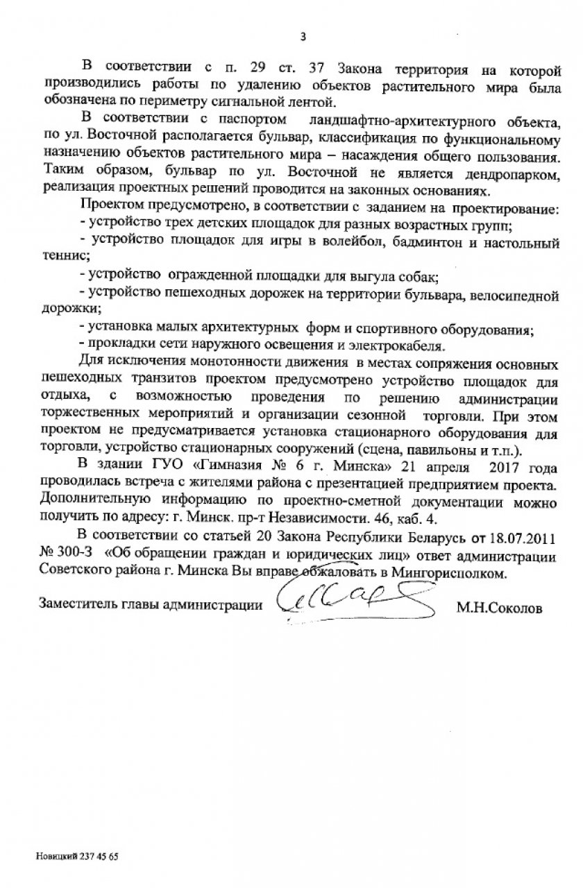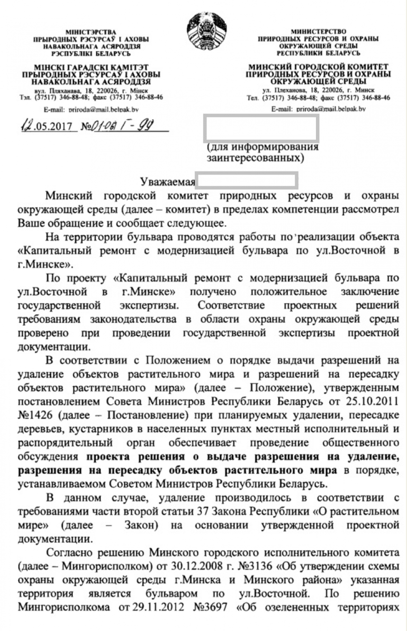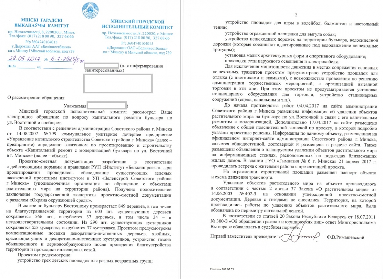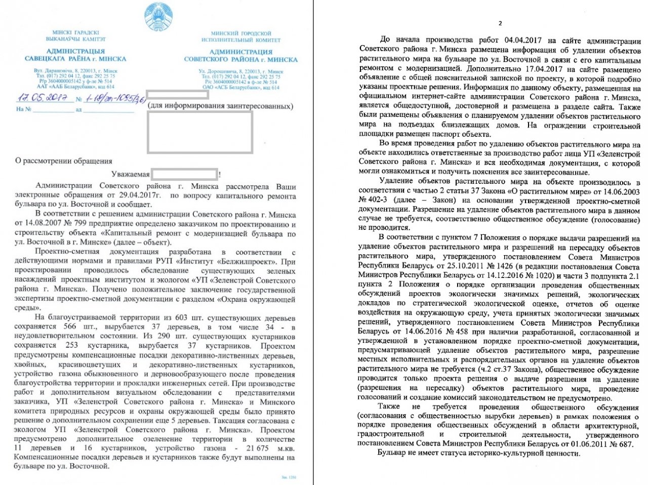 Главное – мы требуем полной остановки работ по вырубке деревьев и строительных работ до момента выяснения обстоятельств, указанных в нашем запросе и до получения общественного согласия на проведение этих работ, как предусматривает законодательство Республики Беларусь.