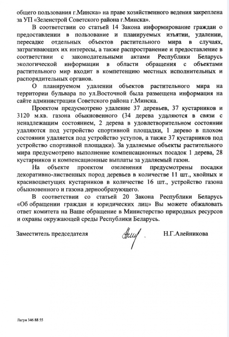 Мы полагаем, что происходящее разительным образом нарушает наши права. Согласно Постановлению Совета Министров Республики Беларусь 01.06.2011 № 687(в редакции постановления Совета Министров Республики Беларусь 10.02.2014 № 109) вырубка деревьев предусматривает согласование с общественностью. Такого согласования не проводилось, нашего мнения не учитывали. Более того, о происходящем мы узнали лишь услыхав шум уже работающих пил.