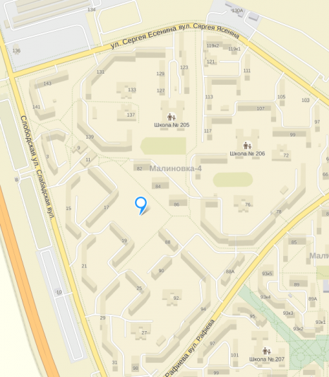 Многие годы дворовая территория между жилыми многоэтажными домами (указано на карте) остается неблагоустроенной. По сути представляет собой заросший пустырь, на котором собаководы выгуливают своих питомцев.