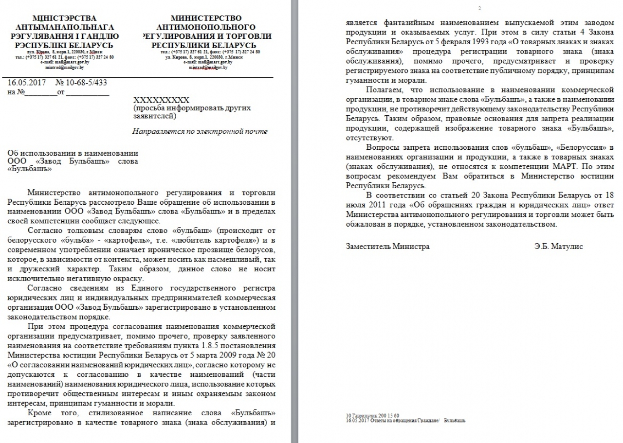 Один из белорусских производителей алкоголя (ООО "Завод бульбашъ") использует в своем наименовании, а также в качестве торговой марки своей продукции слово "Бульбашъ", которое воспринимается большой частью населения беларуси как оскорбительно-унизительное прозвище беларусов. Сложно представить себе, к примеру, водку "Москаль" в России или "Хохол" в Украине. Русские и украинцы, скорее всего, сочли бы подобные названия оскорбительными для своих народов. В то же время в Беларуси, ООО "Завод бульбашъ" при разработке бренда морально-этическими вопросами задаваться не стал. Требуем запретить использование слов "бульбашъ","белоруссия" в качетстве любых официальных названий в целом, и продажу водки "Бульбашъ" в частности. Руководителей ООО "Завод бульбашъ" требуем привлечь к уголовной ответственности по факту публичного оскорбления беларусов и разжигание национальной розни.
