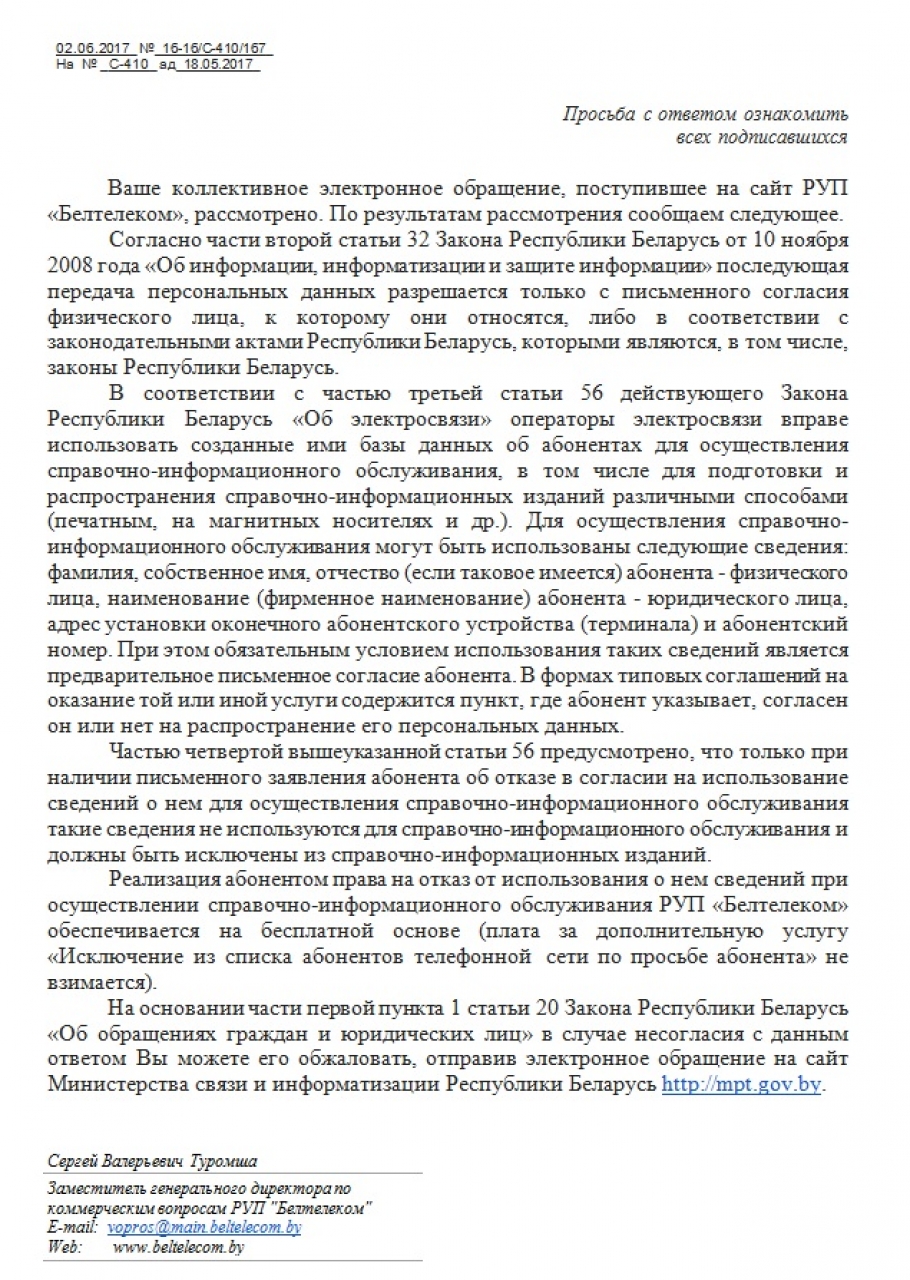 Просим запретить РУП "Белетелеком" передавать данные об абонентах третьим лицам. У РУП "Белтелеком" существует услуга "Доступ к системе предоставления информации об абонентах телефонной сети РУП «Белтелеком» (СПИН) посредством удаленного некоммутируемого доступа". Любое юридическое лицо может получить полный доступ к базе абонентов, включая адреса и контактные данные абонентов. Данная услуга используется различного рода организациями, предлагающих свои услуги посредством "агрессивного маркетинга" (установщики фильтров воды, ремонтники окон, проводки, почтовых ящиков, продавцы верблюжьих одеял и тому подобные "фильтрщики").
