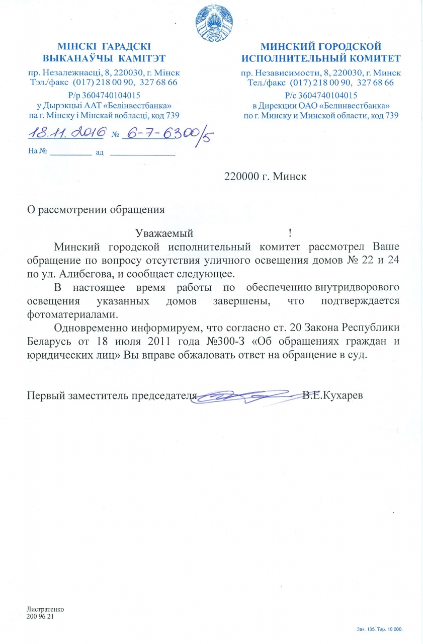 Уличное освещение домов 22 и 24 по ул. Алибегова в г.Минске не передано в Мингорсвет, имеются несанкционированные случаи его отключения. При обращении в оперативную дежурную службу получен ответ, что уличное освещение домов 22 и 24 по ул. Алибегова не передано в установленном порядке и они не могут принять меры по его восстановлению. Просим указать причины затягивания сроков (более года после сдачи домов в эксплуатацию) и установить сроки передачи уличного освещения городским службам.
