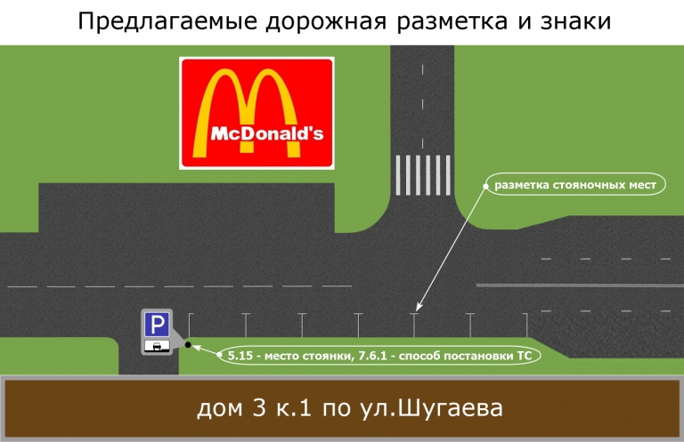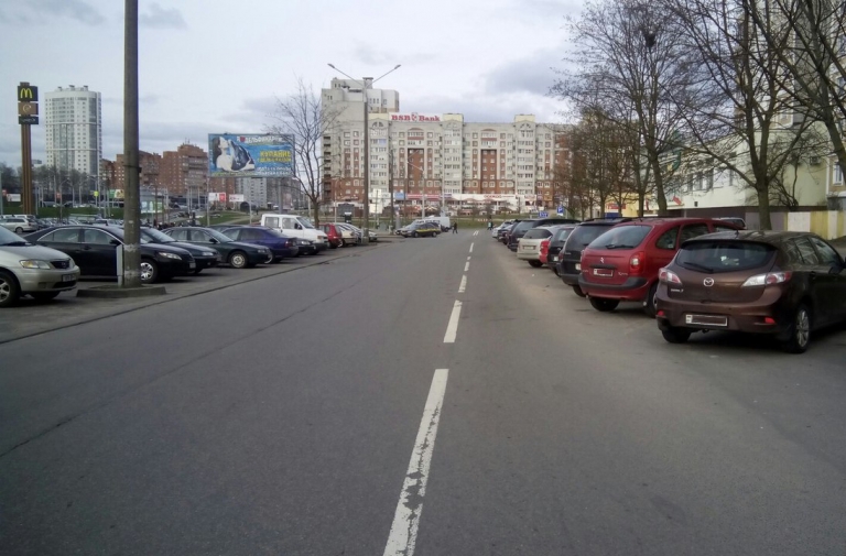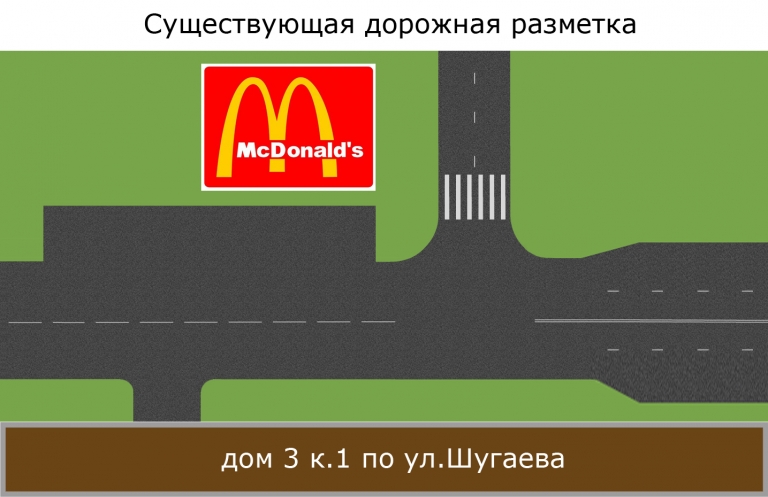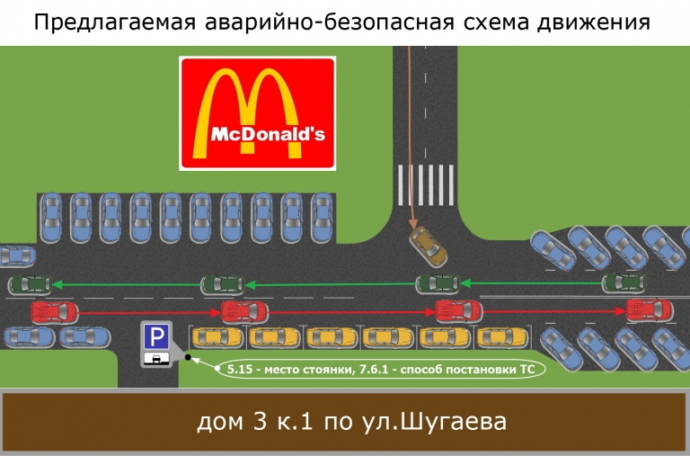 По ул.Шугаева, 2 в г.Минске расположен ресторан Макдональдс - точка притяжения жителей и гостей микрорайона Уручье, многие из посетителей ресторана приезжают на личном авто, в связи с чем на участке улицы Шугаева, примыкающем к ресторану, наблюдается активное пересечение потоков автотранспорта. Выезд с парковки ресторана расположен напротив дома №3 к.1 по ул.Шугаева. Обочина дороги напротив места выезда используется как стоянка, автомобили паркуются там под углом 45 градусов (жёлтые автомобили на схеме). Паркуясь подобным образом, указанные автомобили перекрывают половину полосы движения в сторону ул.Руссиянова. В результате автомобили, двигающиеся по ул.Шугаева в сторону ул.Руссиянова (красные автомобили на схеме), вынуждены частично выезжать на полосу встречного движения, рискуя столкнуться с противоположным потоком (зелёные автомобили на схеме) и автомобилями, выезжающими с парковки Макдональдса (коричневый автомобиль на схеме). Вернуться в свою полосу движения красные автомобили имеют возможность только после проезда участка парковки жёлтых автомобилей, вынужденно пересекая двойную сплошную разделительную линию и тем самым невольно нарушая ПДД. Зелёным автомобилям, двигающимся со стороны ул.Руссиянова, для избежания столкновения с красными автомобилями, вынужденно выезжающими на встречную, приходится прижиматься к правому краю своей полосы, но в районе выезда с парковки Макдональдса им мешают это сделать выезжающие оттуда коричневые автомобили. Вследствие этого в месте выезда с парковки Макдональдса на ул.Шугаева крайне затруднено движение, систематически происходят заторы, особенно в часы пик, существует риск столкновений автотранспорта, в том числе лобовых.
