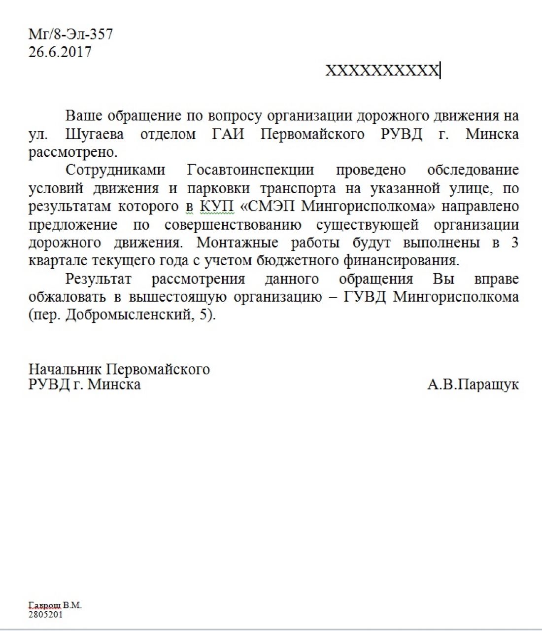 По результатам обследования условий дорожного движения в КУП «СМЭП Мингорисполкома» направлено предложение по совершенствованию существующей организации дорожного движения. Монтажные работы будут выполнены в 3 квартале 2017 года с учетом бюджетного финансирования.