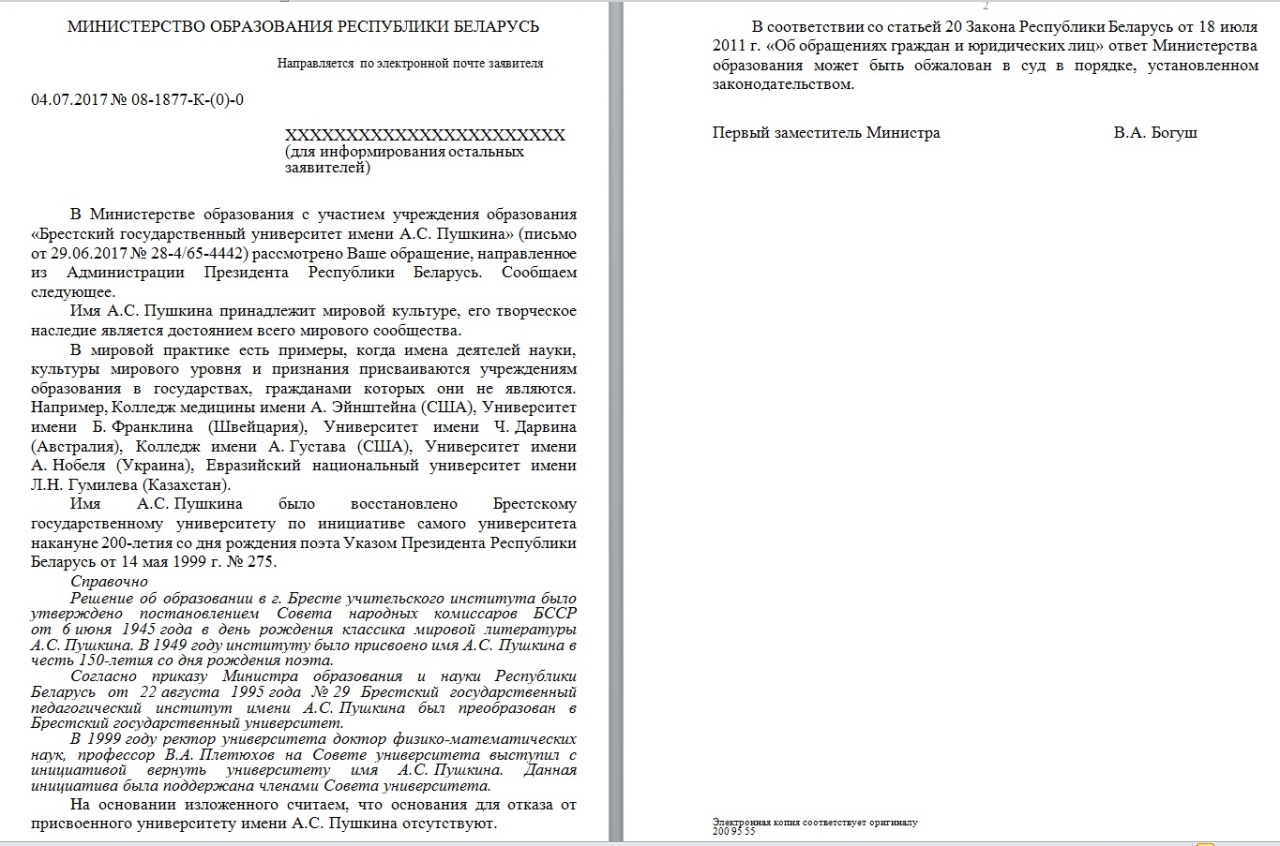 II. А.С. Пушкин отношения к г. Бресту и Республике Беларусь не имеет, считаем, что его имя в названии университета не способствует пониманию и укреплению суверенитета Республики Беларусь. В связи с чем считаем необходимым избавить университет от его имени.